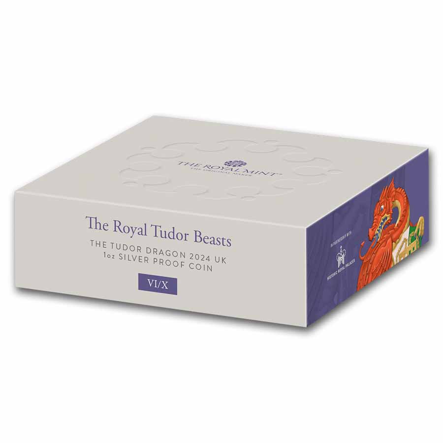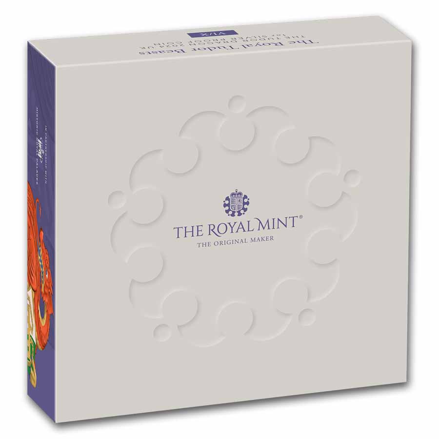 The Royal Tudor Beasts from The Royal MintStarting off in 2022 to follow the conclusion of their widely popular series The Queen's Beasts, The Royal Mint released The Royal Tudor Beast series opening with the Seymour Panther followed shortly after by the Lion of England. This long awaited 10-coin series will include gold and silver proofs, among them this 1 oz silver proof, that feature these heraldic beasts of the Tudor legacy: The Seymour Panther, The Lion of England, The Bull of Clarence, The Tudor Dragon, The Greyhound of Richmond, The Royal Dragon, The Yale of Beaufort, The Seymour Unicorn, The Queen's Panther and The Queen's Lion.
