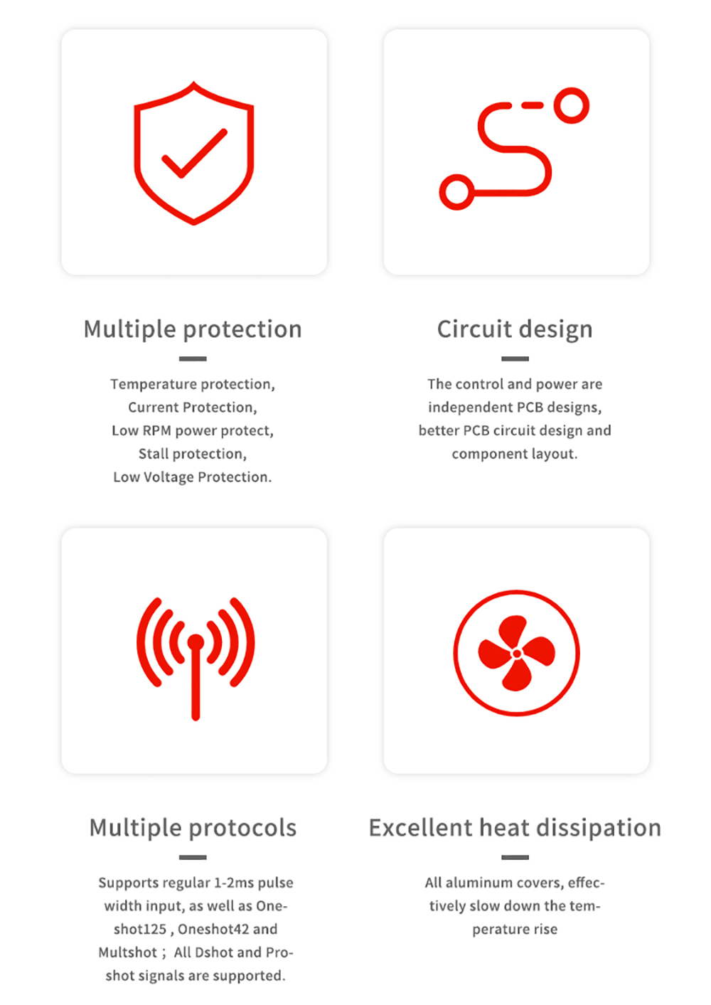 4. Multiple Protocols: Supports regular 1-2ms pulse width input, as well as One-shot125, Oneshot42 and Multshot ; All Dshot and Pro-shot signals are supported