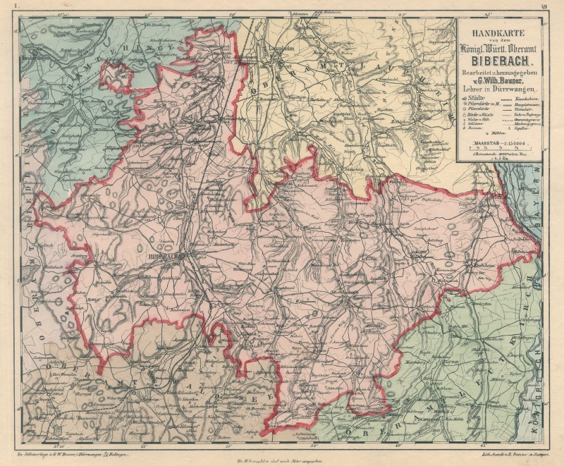 BIBERACH/Riss ( Umgebung ): Farblitho.- Karte, v. L. Sautter n. G.W. Bauser, 'Handkarte von dem Königl. Württ. Oberamt Biberach.',