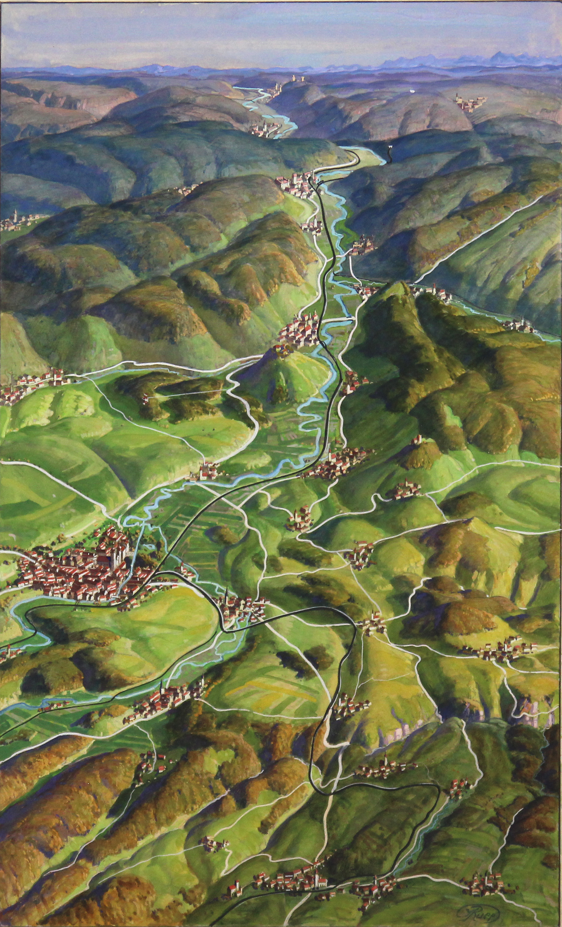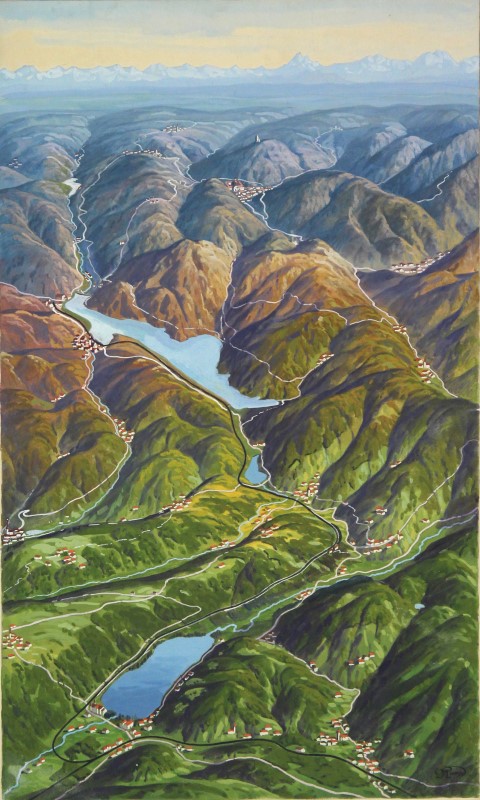 Il foglio è firmato in basso a destra 'J. Ruep '. Lo spettatore guarda da nord sopra Hinterzarten e il titisee e segui il Dreieenbahn per SeeBrugg Am Schluchsee. Dietro St. Blasien e Höchenschwand, il panorama alpino sullo sfondo. - In colori vivaci, montati su tela e con una legenda su carta trasparente.