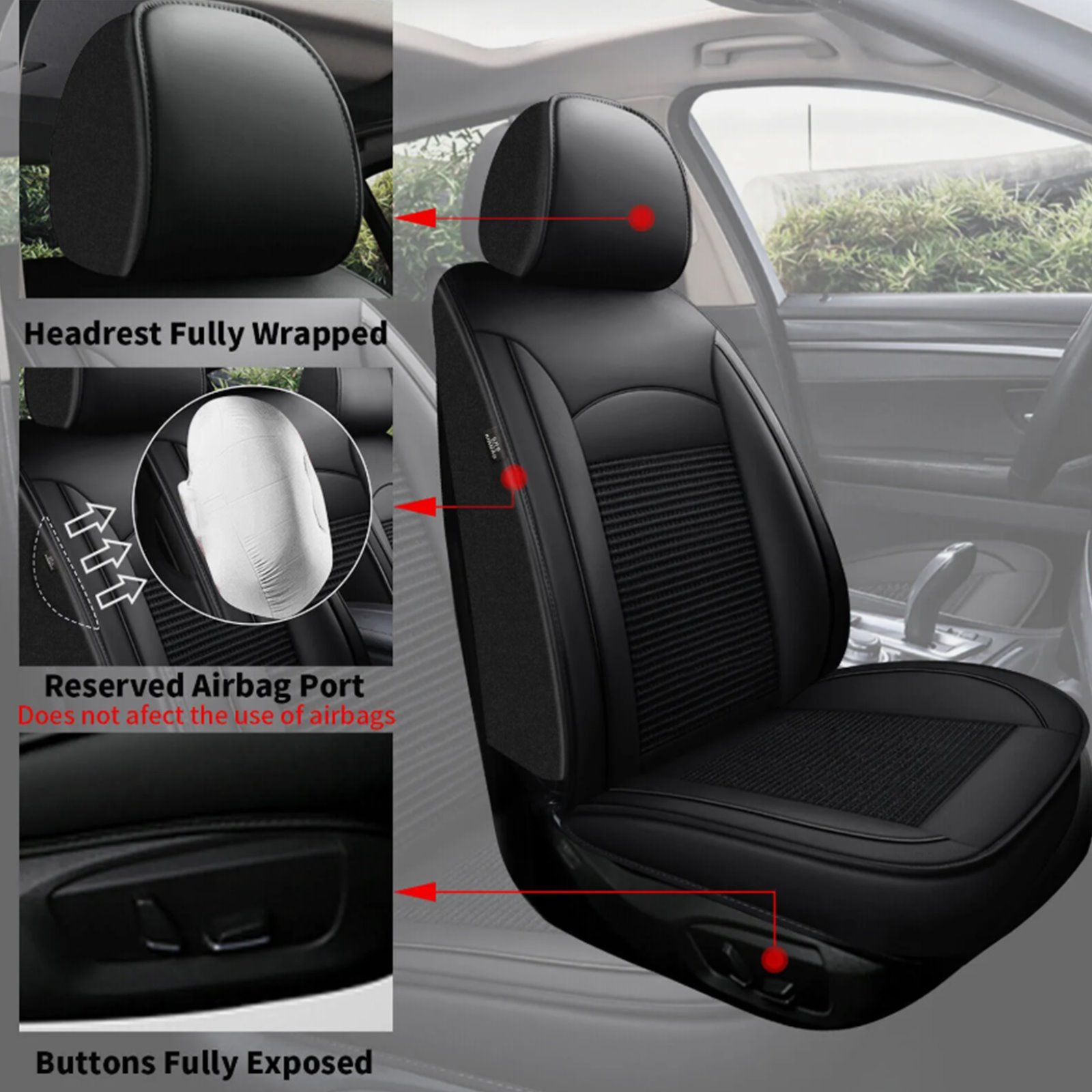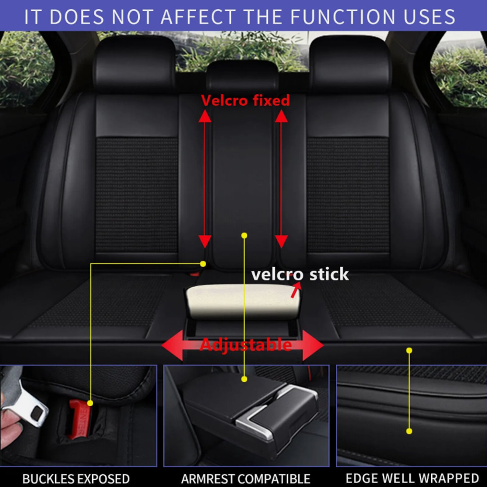 The single-needle stitching on the sides of the fully-wrapped seat won't get in the way of seat belt locks and airbags. Will not affect the heating function of the seats. (Tip):doesn't fit cars with front armrests and sports seats.