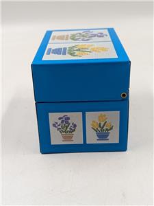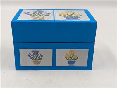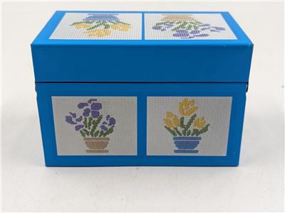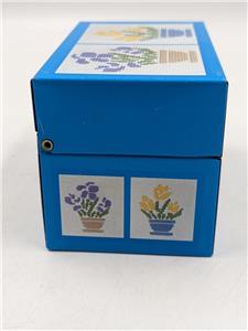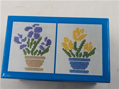 Description – Brightly colored lithography graphics featuring cross stitch potted flowers designs. Inside of the box is gray.