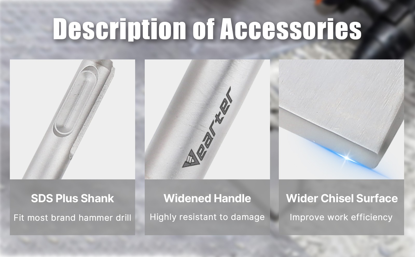 3. Thanks to 40Crmo Steel which provides better Strength, Toughness and Hardness,Vearter SDS plus chisel is able to withstand more wear, pressure and damage , to ensure high quality, long life and high efficiency.