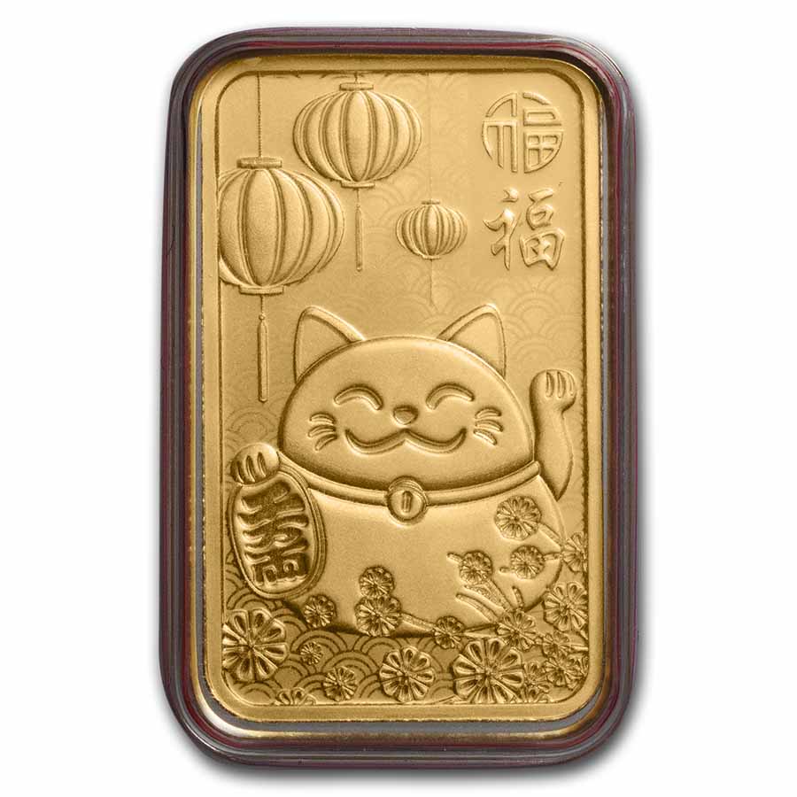 - Obverse: Shows a happy cat waiving its paw while holding a gold bar with lanterns floating in the background.