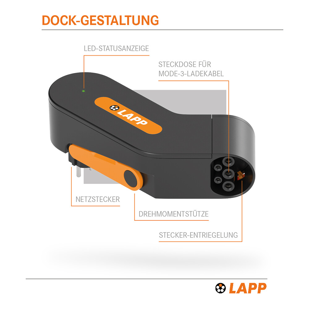 Das nicht im Lieferumfang enthaltene Mode 3-Ladekabel, kann mühelos zwischen dem Fahrzeug und dem mobilen Ladegerät verbunden werden, welches dann an das Stromnetz angeschlossen wird. Hierbei gilt der genormte Typ 2 Stecker als Adapter-Anschluss. Lapp Mobility bietet dir viele Möglichkeiten, ein für dich passendes Ladekabel zu finden. Der Mobility Dock übernimmt nicht nur den Ladevorgang, sondern beinhaltet auch wichtige Schutzfunktionen. Darunter fallen die Überwachung von Überstrom und Übertemperatur, sowie den Schutz des Benutzers.