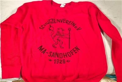 ITEM: Vintage red sweatshirt from German for Schutzenverein which is a target shooting association using Olympic rules. The sweatshirt is small probably a child's size. The tag is in German and has a 5 as the size. I don't know what that translates to for the USA.