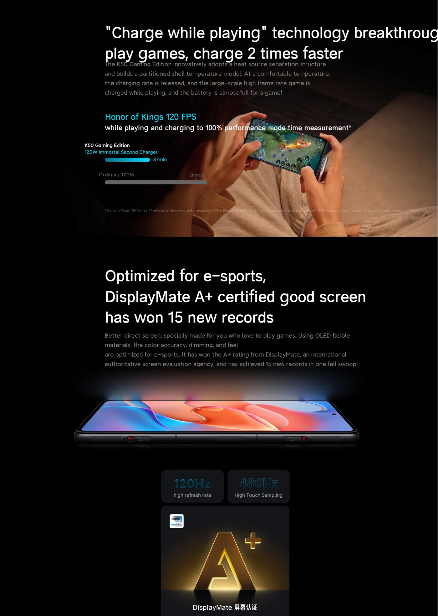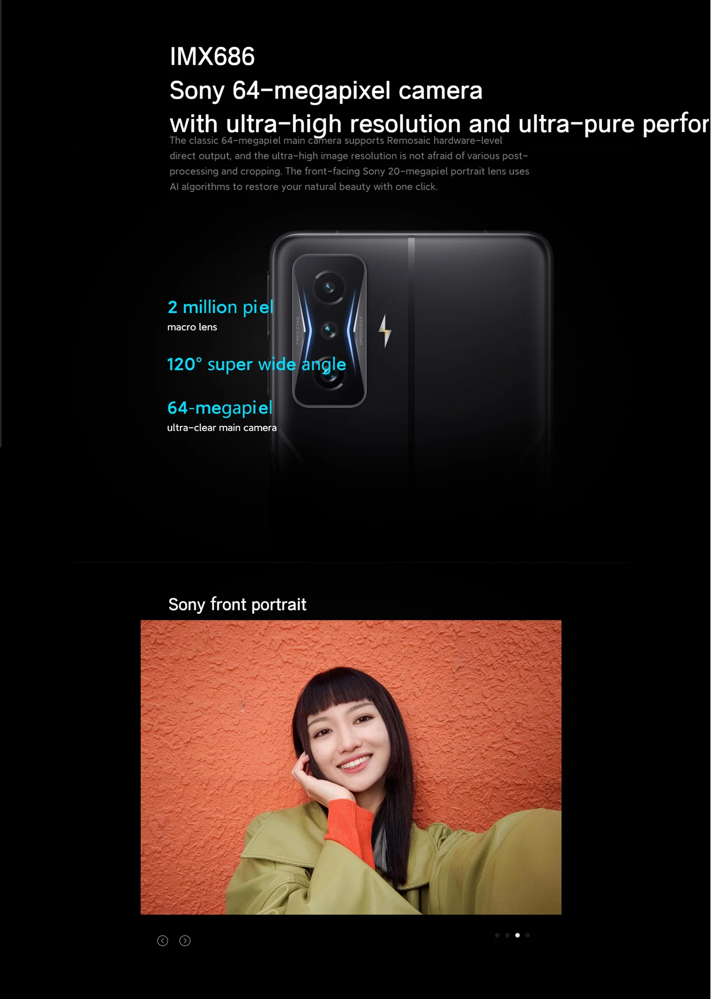 >Camera------ 64MP 8MP 2MPTriple Rear camera, 20MP front camera;Upto 480Hz touch sampling rate;2400 x 1080