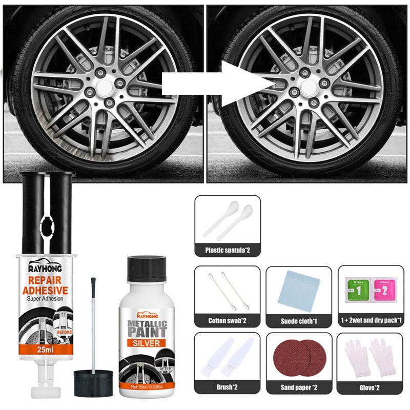 Description: Alloy Wheel Repair Adhesive Kit is specially designed for aluminum alloy, iron, steel wheels. This paint adheres firmly to metal surfaces and forms a protective layer. Wheel Scratch Repair Kit is rustproof and waterproof, and will never fade after long-term use. DIY Alloy Wheel Repair Kit can repair kerb damage, scratches, minor dents, mounting damage, sanding marks and other damage on the wheel hub. Instructions 1. Sand the damaged area with sandpaper 2. Wipe the damaged area with a wet and dry towel 3. Wipe the damaged area with a dry rag 4. Squeeze out an appropriate amount of glue and stir well with a spatula 5. Fill damaged area with spatula 6. Wipe with wipes 7. Dry with a dry rag 8. Apply silver paint to the damaged area and wait for it to set Specification: Name: Wheel Scratch Repair Kit Capacity: Repair glue 25ml, silver paint 10ml Size about: Repair glue 4.2x17cm/1.65x6.69in, silver paint 2.2x5.6cm/0.87x2.20in Shelf life: 3 years Packing list: Repair glue 25ml*1 Silver paint 10ml*1 1+2 towel*1 Cotton swab*2 Cleaning cloth*1 Gloves*2 Scraper*2 Sandpaper*2 Brush *2 Note: Due to the lighting effects and shooting angles, there is color difference in the product, please understand. Due to manual measurement, there is a tolerance in the product size.