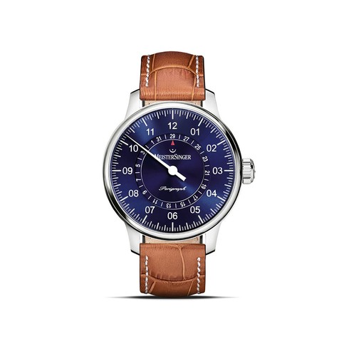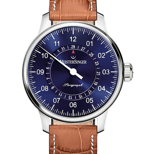 Der Perigraph mit nachtblauem, fein changierendem Sonnenschliff zählt längst zu den Klassikern von MeisterSinger. Der Datumsring ist komplett freigelegt, strukturiert das Zifferblatt und verleiht ihm Tiefe. Ein kleiner roter Pfeil bei 12 Uhr verweist auf das aktuelle Datum.