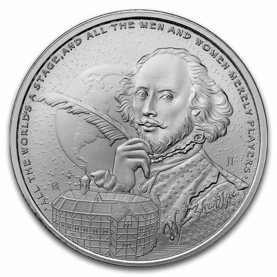 This release includes 10,000 silver BU, 100 proof silver and 100 gold BU coins designed by the esteemed artist Joel Iskowitz. Ten of the proof silver and gold BU coin certificates of authenticity are signed by Joel Iskowitz to add an extra level of appeal. The obverse depicts William Shakespeare holding a feather quill along with the Globe Theater. The background displays the image of Earth and the quote All the world's a stage and all the men and women merely players along the edge.
