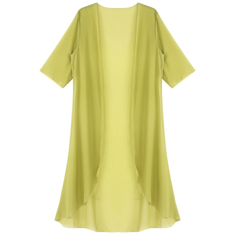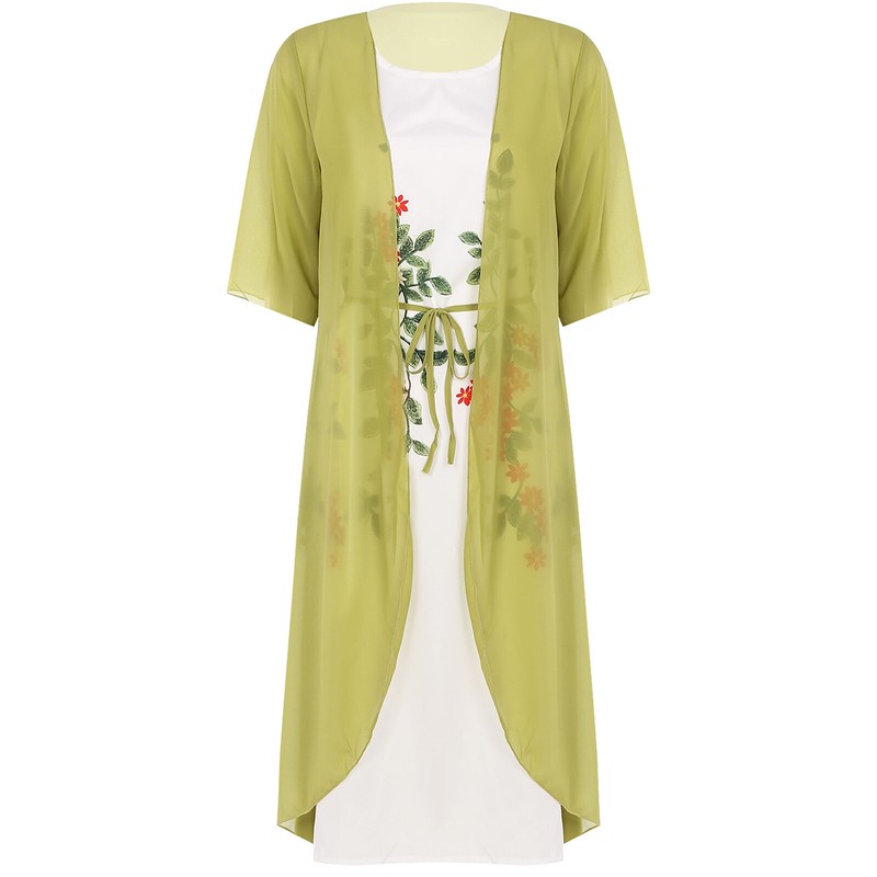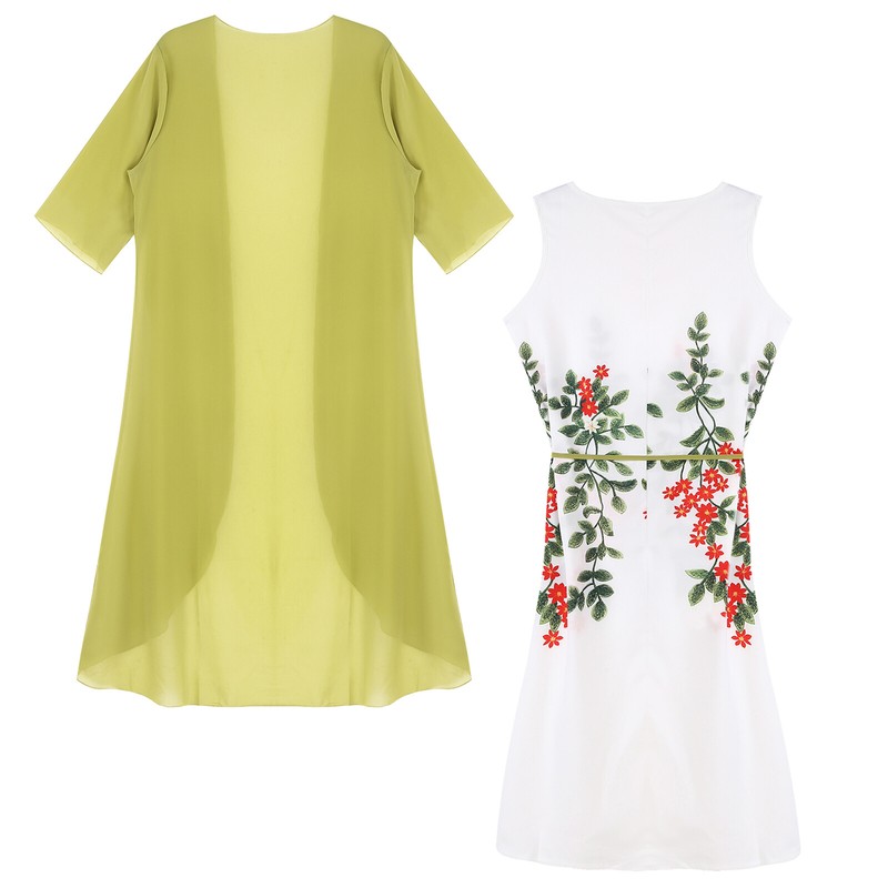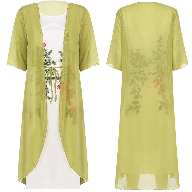 Round neck sleeveless dress with floral print or embroidery, pair with half sleeve open front sheer chiffon robe.