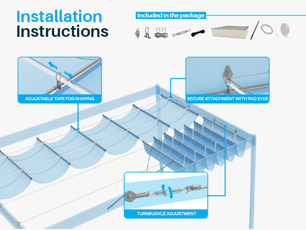 - Easy to Install: Includes detailed instructions. Each rod has pre-drilled holes on each end to attach the shackle and snap hook to the wire cable you mounted. Applicable to existing canopies, trellises, gazebos, or newly established frame structures