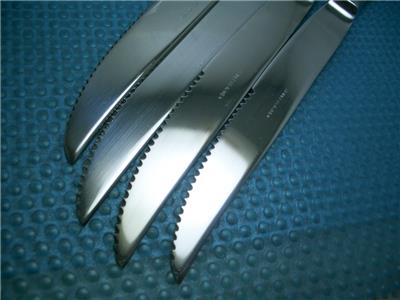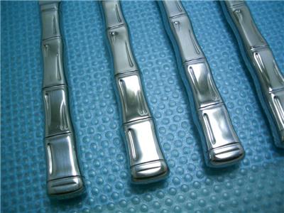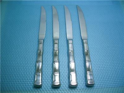 EXOTIC BAMBOO STAINLESS KOREA HOLLOW HANDLE STEAK KNIVES-SET OF 4. MADE BY SUNSHINE PRODUCTS. IN NEW CONDITION WITH NO SIGNS OF USE. THEY MEASURE: 9 1/4" LONG. GREAT STURDY PIECES.