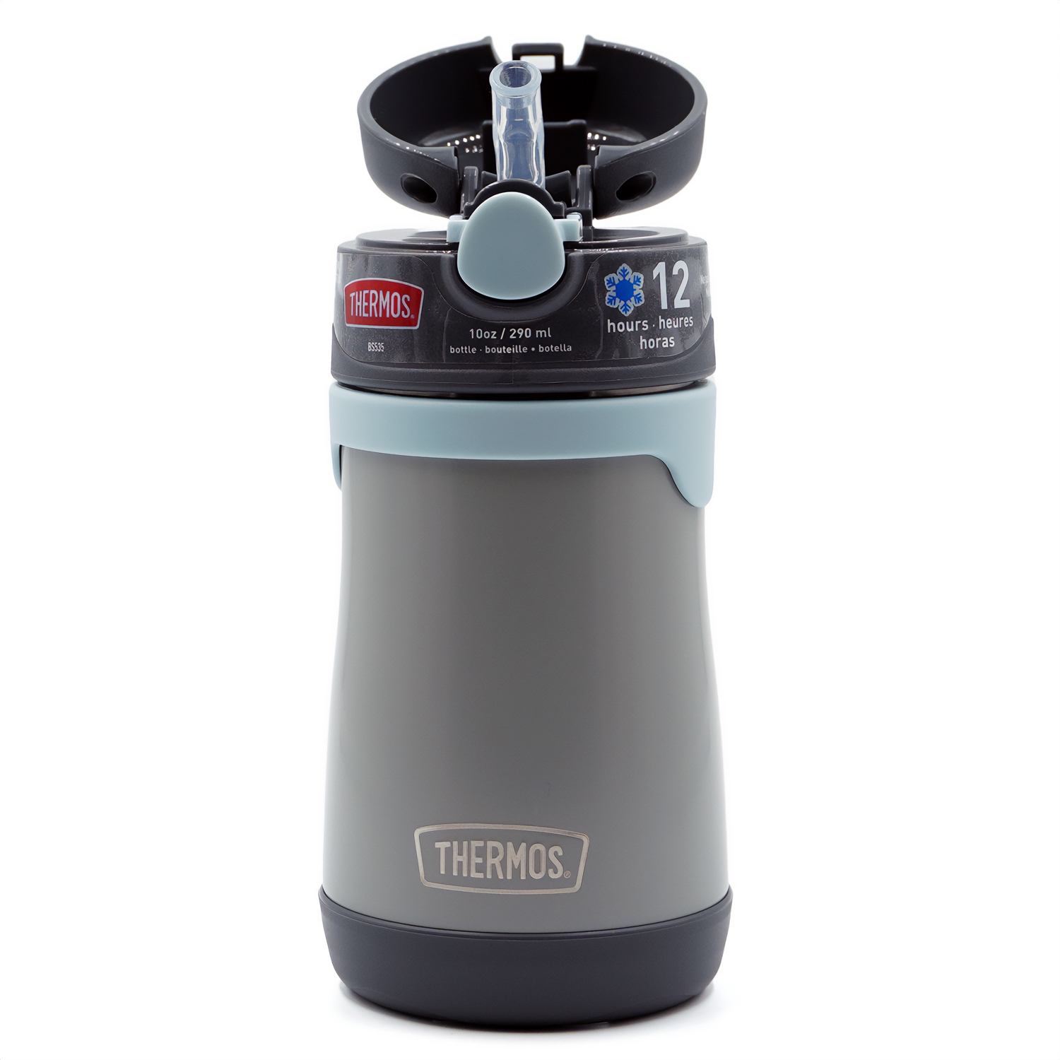The Thermos 10 oz. Kid's Vacuum Insulated Stainless Steel Straw Water Bottle keeps your child's favorite beverages cold for up to 10 hours so they can enjoy all day long! The easy-to-grip contoured body makes holding and carrying a breeze for your little ones. The exterior stays condensation-free and the durable stainless steel construction is BPA-free. This bottle features an easy push-button lid and soft silicone straw that is comfortable to drink from.