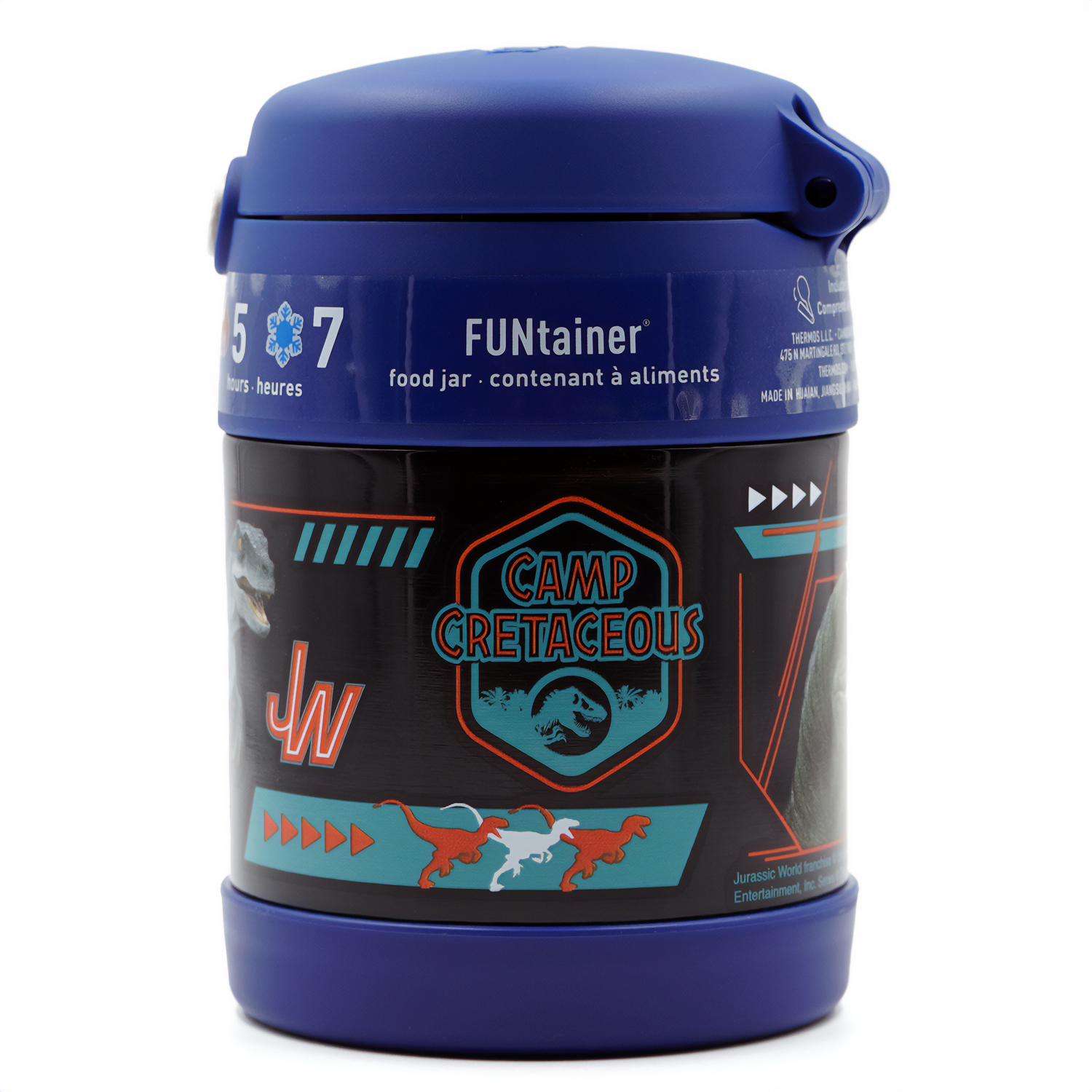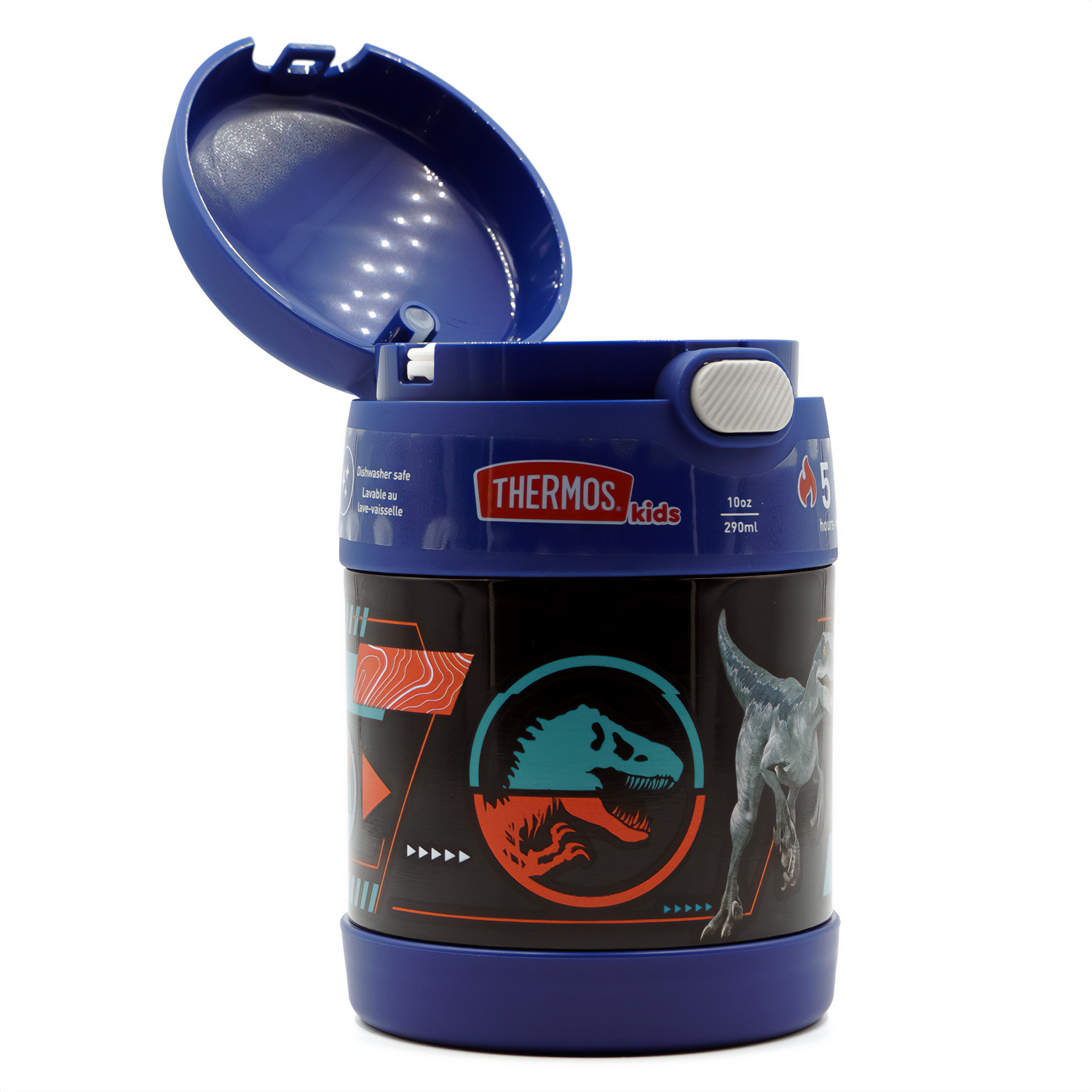The Thermos 10 oz. Kid's Funtainer Vacuum Insulated Stainless Steel Food Jar features durable stainless steel construction with vacuum insulated technology to keep hot foods hot and cold foods cold. Send your child to school with their favorite soup so they can enjoy it fresh and hot at lunch time. If they're in the mood for a cold snack, pack it up with yogurt and berries or apples and peanut butter. This food jar is lightweight and compact with a push button lid, so it is easy to carry and open. Included is a full-sized stainless steel spoon that folds down for easy storage.