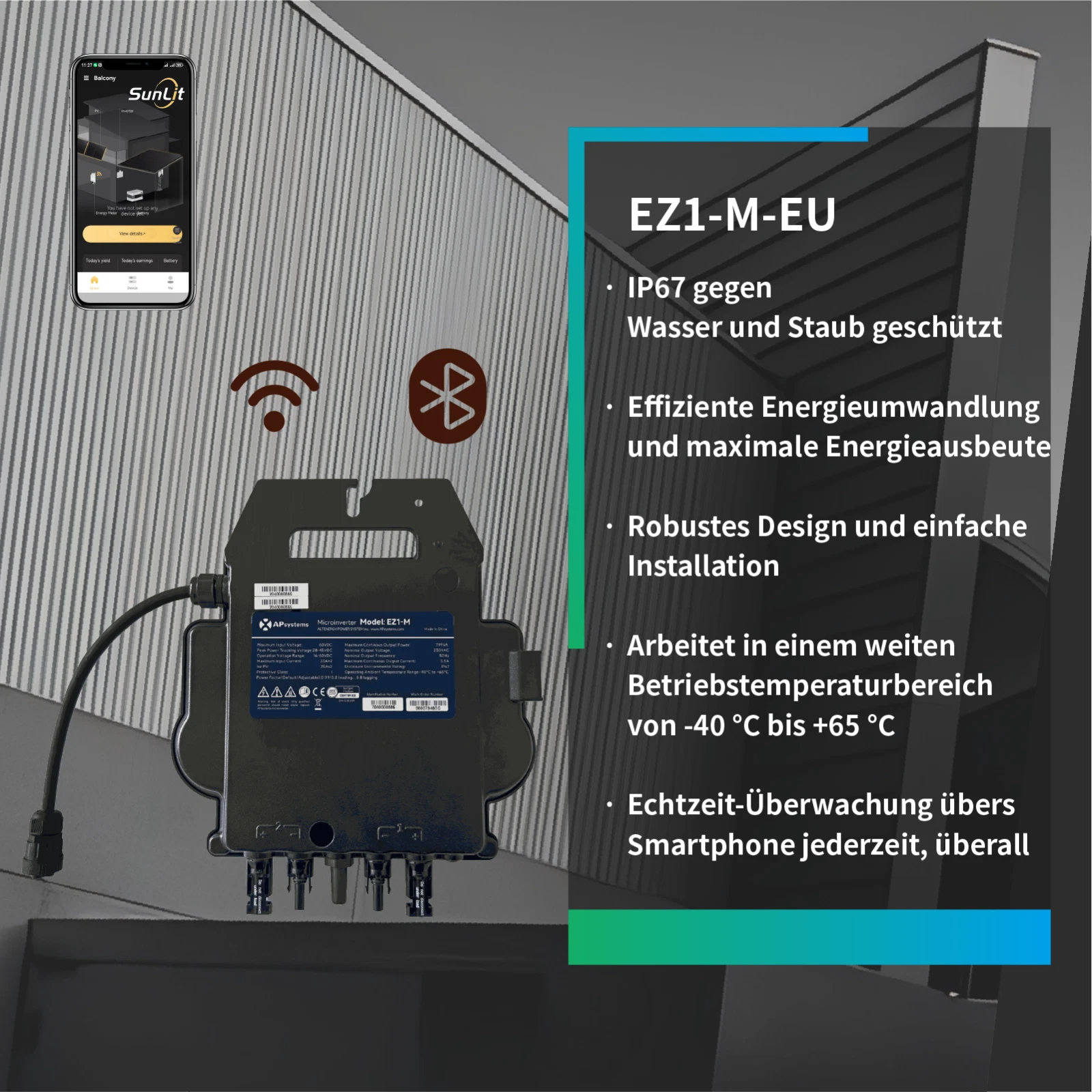 Integriertes Wi-Fi und Bluetooth: Mit integrierter Wi-Fi und Bluetooth-Konnektivität können Nutzer ihre Solaranlage in Echtzeit über die AP EasyPower App überwachen. Dies ermöglicht eine einfache Fernüberwachung und Datenübertragung an Cloud-Server für eine verbesserte Systemkontrolle.