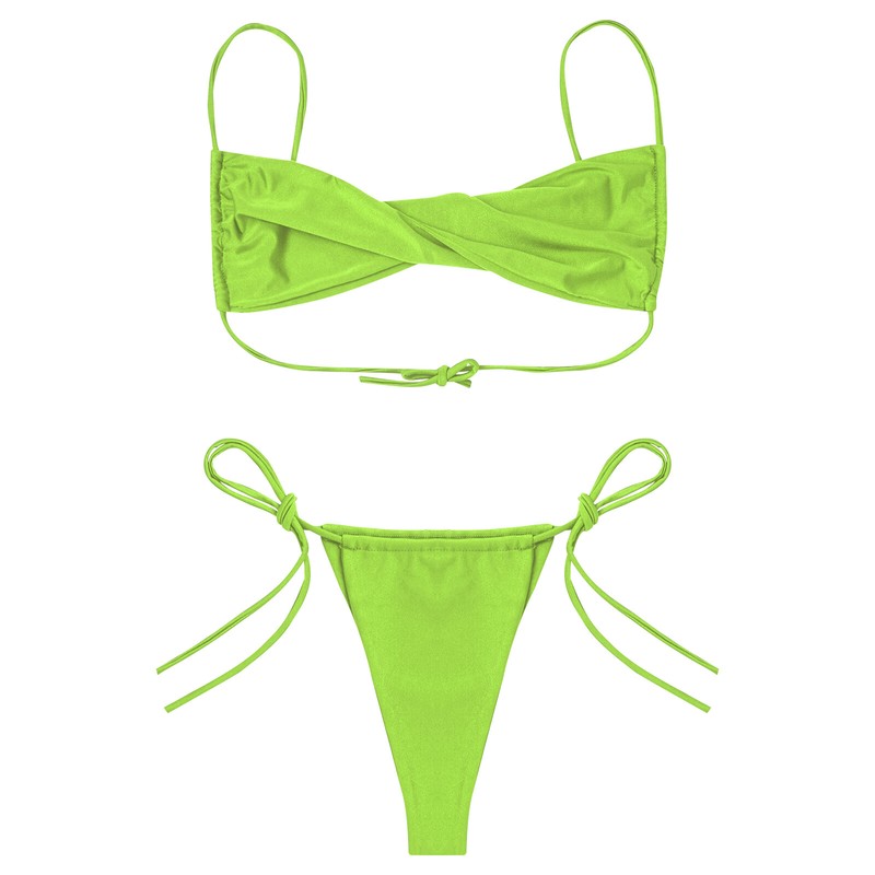 2-piece bikini bathing suit for women, designs with lace-up closure, spaghetti straps, pad and wire free, high cut, T-back, solid color.