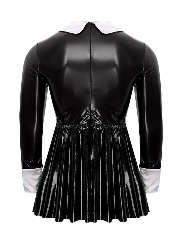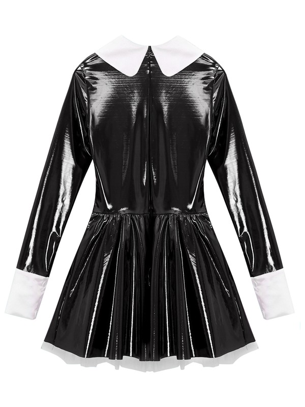 Entworfen mit Puppe Halsumfang, lange Ärmel mit Knopfmanschetten, Lacklederrock mit mehrlagigem Tüll-Unterrock, Reißverschluss hinten.