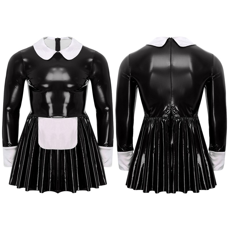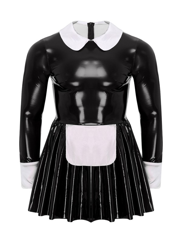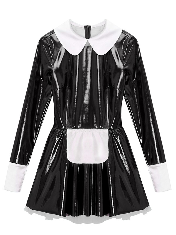 Satin Halsumfang, Manschetten und Schürze erinnern an glänzendes Lackleder, vermitteln ein Gefühl von Niedlichkeit und lassen Sie wie ein echtes Dienstmädchen aussehen.