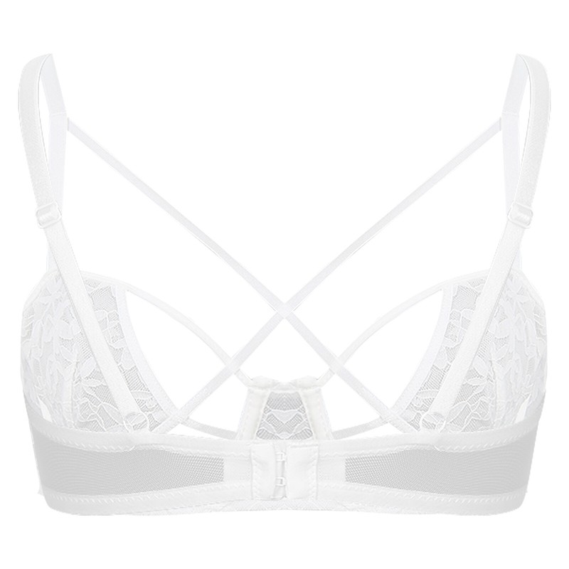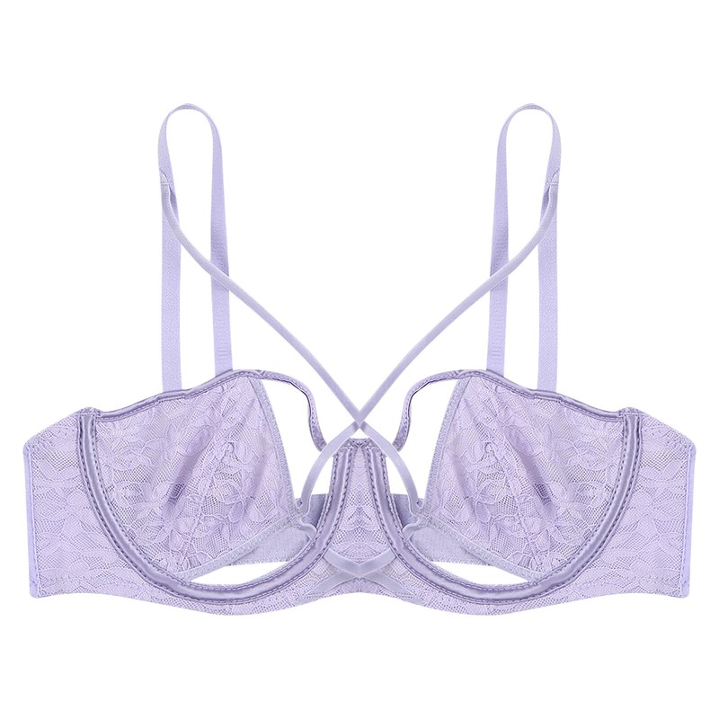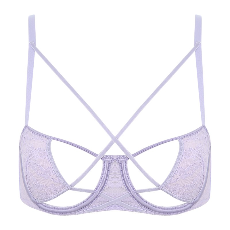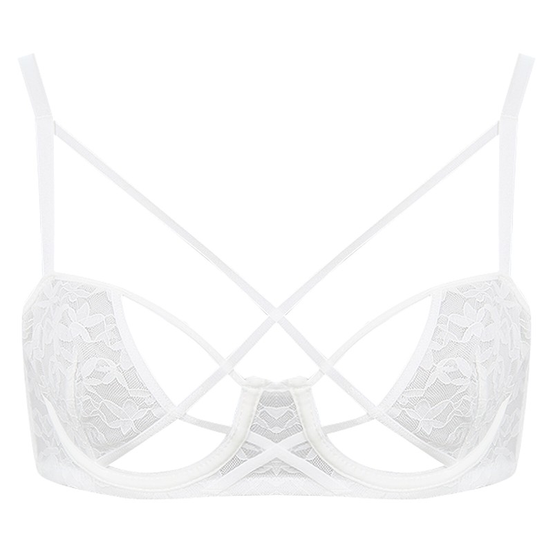 Der Balconette-BH ist mit Bügel ausgestattet, ohne Polster und ungefüttert, mit Spitze mit Aussparungen und Riemchendetails und einem zweireihigen Haken- und Ösenverschluss auf der Rückseite.
