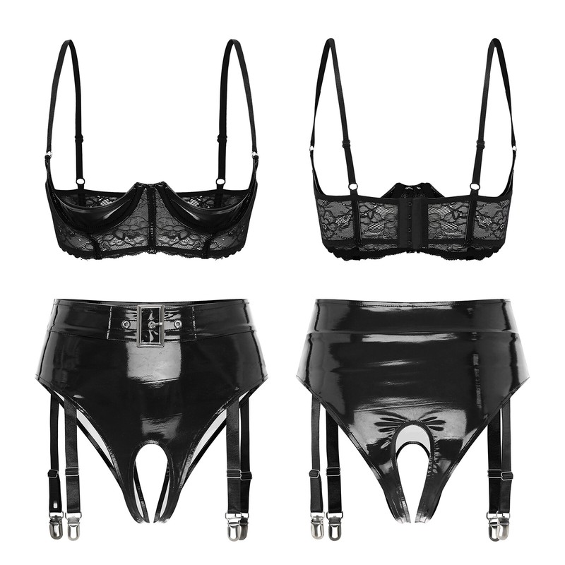 Underwear designs with high waist and open crotch. Adjustable metal garter clips can hold the stockings to prevent slip off.