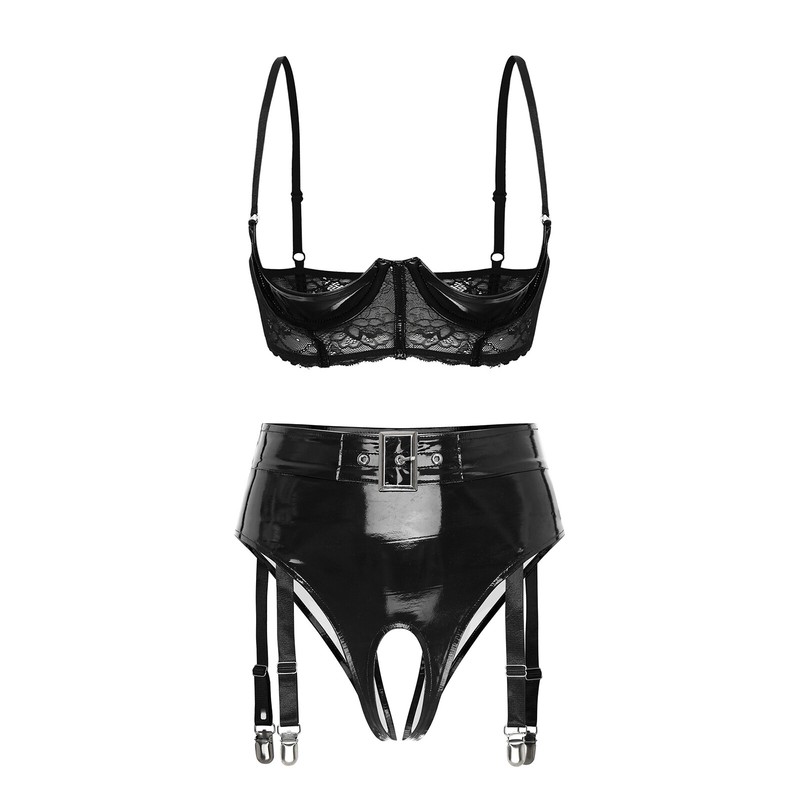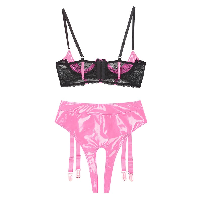 Bra designs with floral lace and patent leather spliced, 1/3 cup with underwire, adjustable shoulder strap and back hook&eye closure.