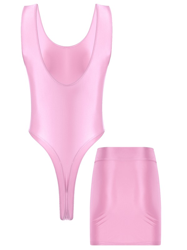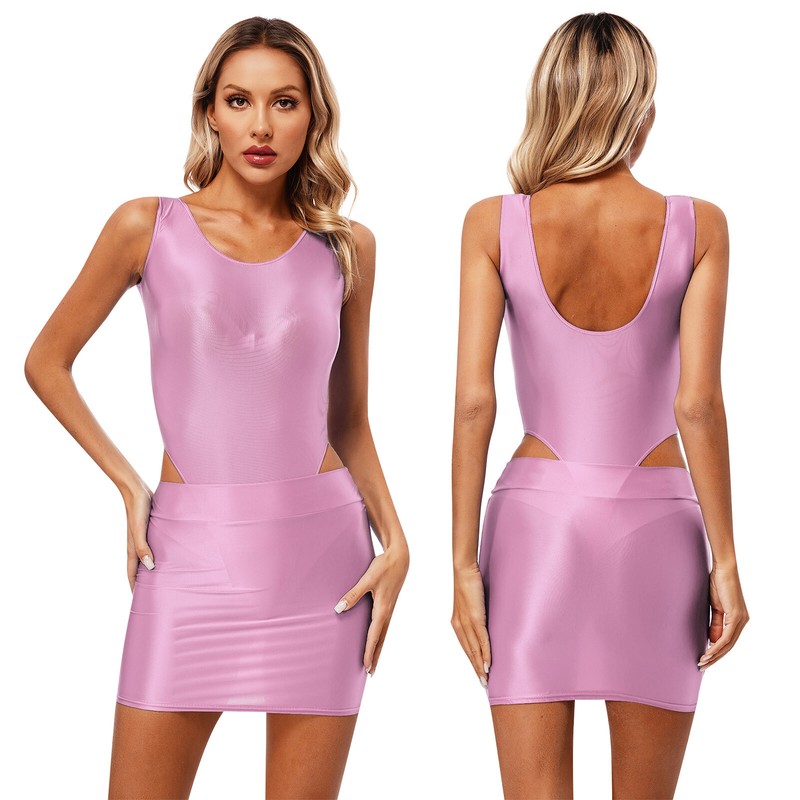 Glossy bodysuit for women, solid color, round neck, sleeveless, high cut design, backless.