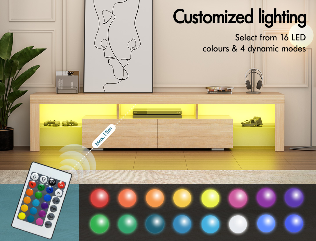 Features * Customisable RGB LED light with remote control* Select from 16 LED colours and 4 flashing modes* Can provide adequate lighting for seniors to keep safe* Enhanced wear-resistant melamine finish* Scratch-resistance* E1 grade & 15mm thick particle board (Both frame and drawers)* 5mm thick tempered glass shelves* Solid construction* Push-to-open drawers * 1 rebound device at the middle for each drawer* Durable stainless steel slide rails* Minimalist backing * Easy to clean * Easy assembly