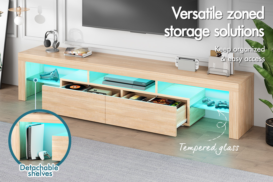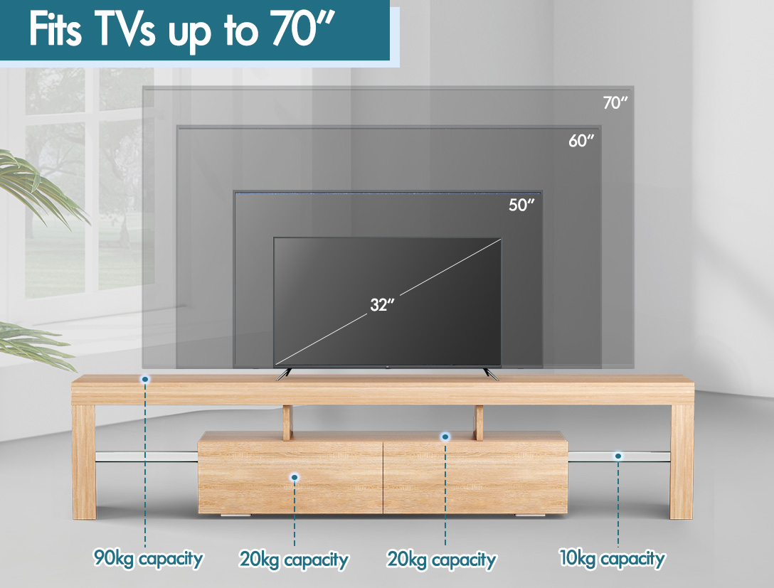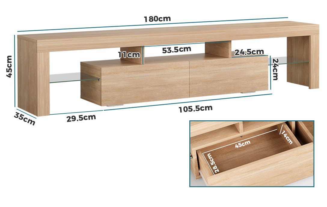 Specifications * Colour: Oak * Material: Particle board and MDF, tempered glass * Frame: 15mm particle board * Finish: Melamine * Edge: PVC* Suitable TV size: 70-inch and less * Overall dimensions: 180 x 35 x 45cm Refer to dimension photo for detailed sizes * Number of packages: 2