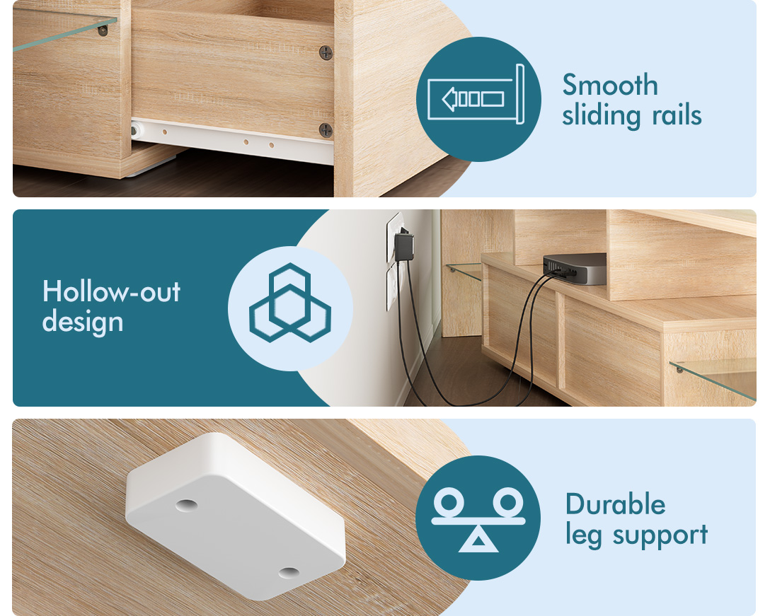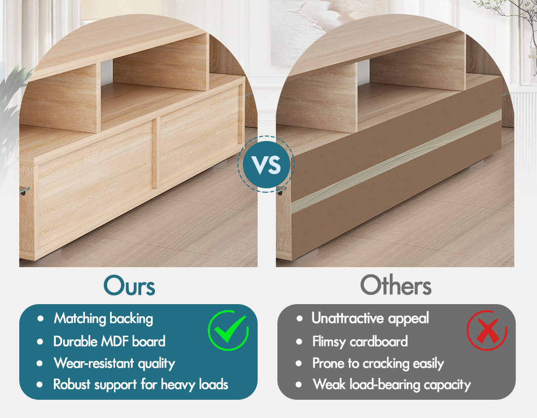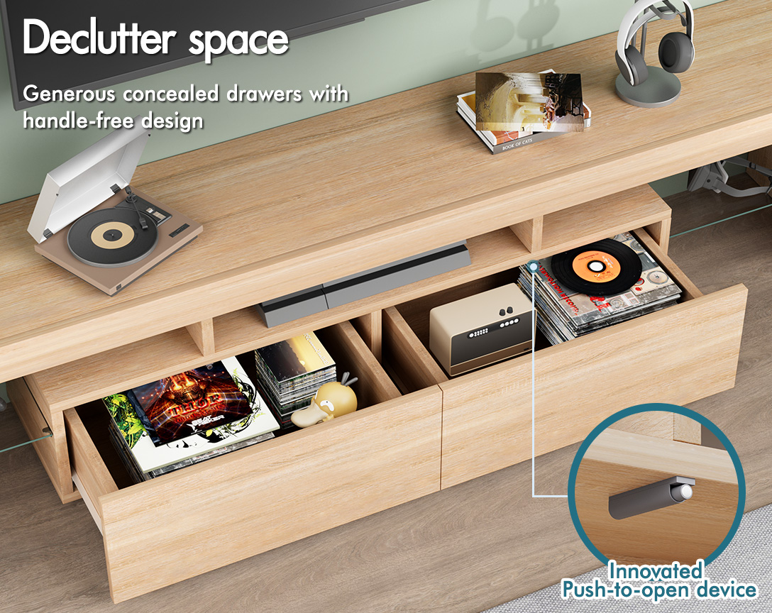 Reliable quality - Made of superior E1 grade and 15mm thick particle board, our entertainment unit is durable and resistant to scratches. Instead of flimsy paper finish, it is well made with smooth melamine finish which is easy to maintain and long lasting. Equipped with push-to-open system, the drawers quietly open and close so you can access your items with ease.
