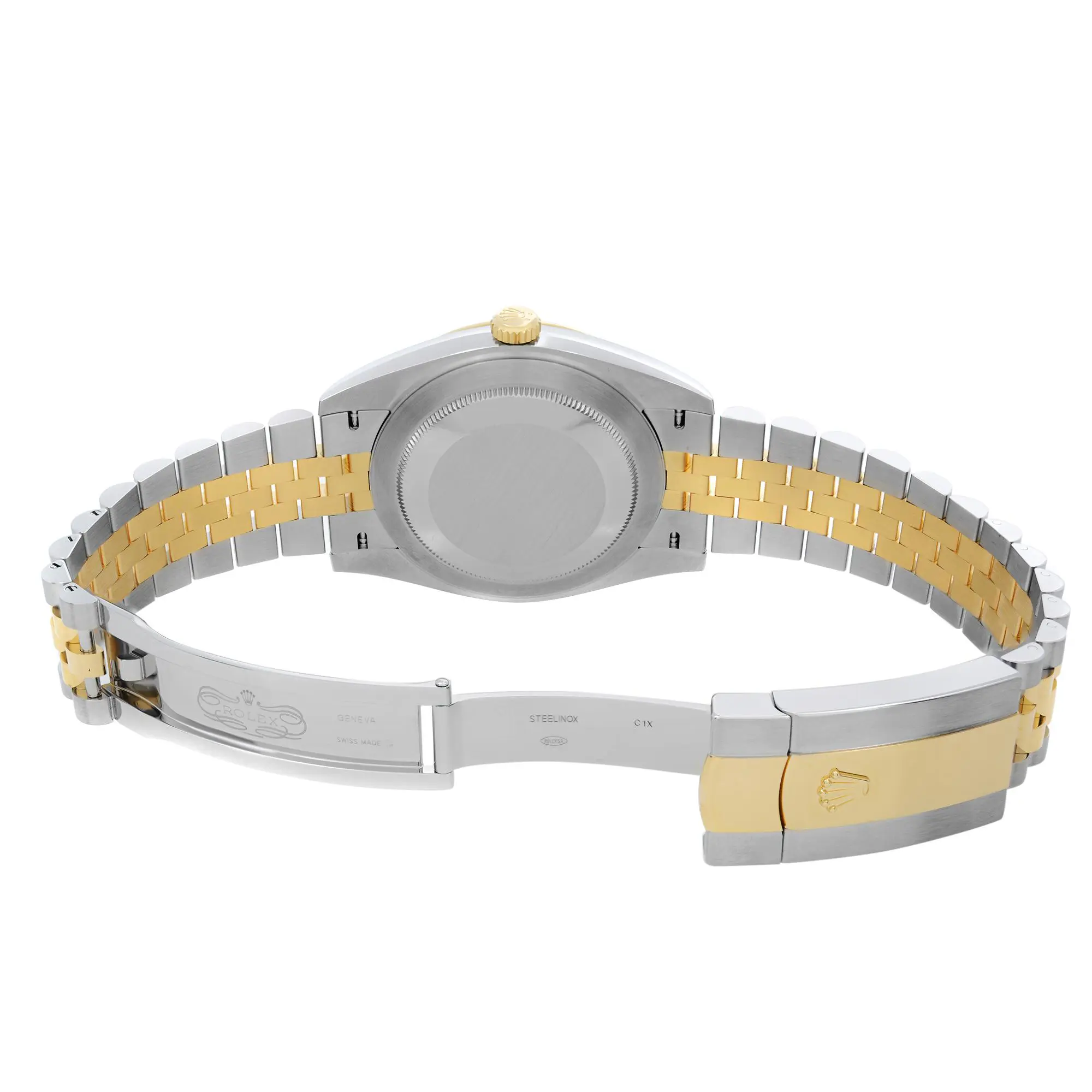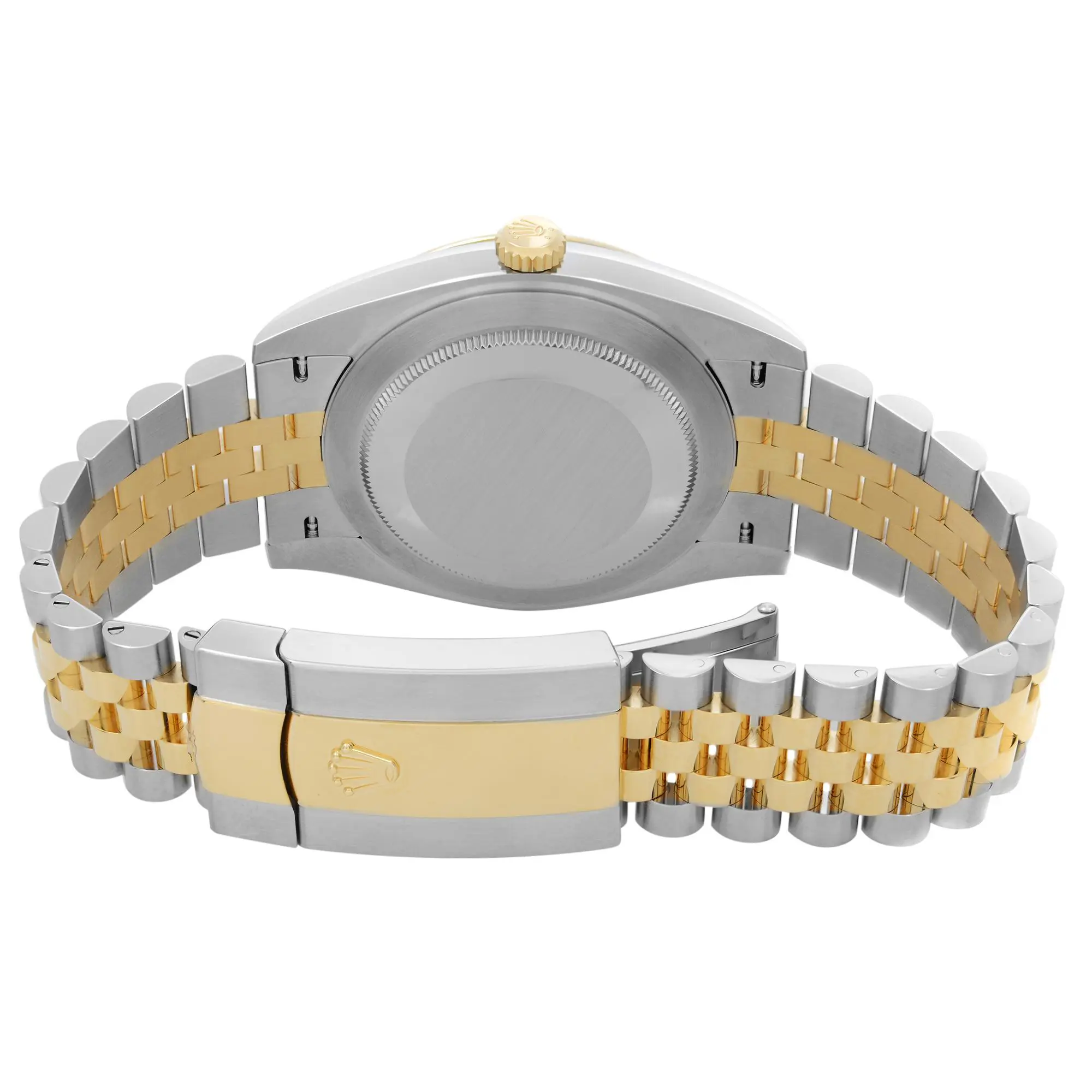 An image of a pre-owned Rolex Oyster Perpetual Datejust men's wristwatch, viewed from a direct, full frontal angle, filling the frame. The watch features a round champagne dial with gold-tone bezel, luminous hands, a date indicator at the 3 o'clock position, and 12-hour dial indices. It has a stainless steel case and a two-tone band made of stainless steel and solid gold. The condition is classified as excellent, with minor signs of wear and slight scratches visible upon close inspection. An image of a pre-owned Rolex Oyster Perpetual Datejust men's wristwatch, presented in a front close-up view highlighting the watch face at a straight-on angle. The watch features a luxurious round champagne dial encased in stainless steel, with a gold bezel and a stainless and solid gold band. The dial includes 12-hour indices, a seconds hand, and luminous hands, with a date indicator displayed at the 3 o'clock position. The condition is excellent, with minor signs of wear or scratches visible upon close inspection. The Rolex logo and the text "Superlative Chronometer Officially Certified" are discernible on the dial. An image of a pre-owned Rolex men's wristwatch, captured from a side profile angle showcasing the crown. The watch features a round shape with a champagne dial and gold bezel. The band is made from a combination of stainless steel and solid gold, presenting a two-tone appearance. Visible features include a date indicator at the 3 o'clock position and luminous hands. There are minor signs of wear and scratches on the watch, consistent with its pre-owned condition. The image is taken from a close distance, emphasizing the watch's luxury style and details. An image of a pre-owned Rolex men's luxury wristwatch, presented in a front close-up shot showcasing the watch face at a slight tilt. The round dial is champagne-colored with gold indices and luminous hands, featuring a date indicator at the 3 o'clock position. The bezel is gold, and the band is made of alternating stainless steel and solid gold links. The case material is stainless steel. The watch is viewed from a close distance, emphasizing its condition classified as excellent. The watch shows minor signs of wear or scratches. An image of a pre-owned men's Rolex wristwatch showcasing the back view with the clasp closed. The watch, composed of stainless steel with a screwback caseback and a band featuring stainless and solid gold links, is displayed at a medium distance with the round case centered in the frame. The fold-over clasp is visible in the foreground, and the watch is positioned at a slight angle to reveal the brand's logo on the clasp. Minor signs of wear or scratches are observable on the surfaces. An image of a pre-owned men's Rolex wristwatch showing the back view with an open clasp. The round case and screwback are made of stainless steel, and the band is a combination of stainless steel and solid gold. The watch is positioned at a slight angle with the top facing towards the upper left corner of the image, and the clasp is in the foreground. Minor signs of wear or scratches are visible on the surfaces. The distance is close enough to show detail while capturing the entire back side of the watch.
