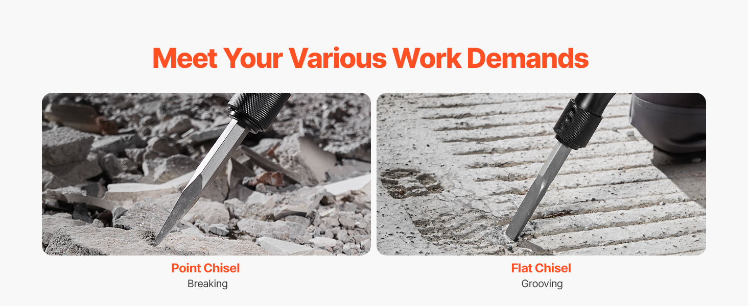 Wide Range of Applications: The 110V power demolition drills & hammers include 2 chisel bits (flat chisel and point chisel). It is perfect for demolition, trenching, chipping, and breaking holes in concrete, block, brick, and tile. It is also ideal for various applications such as pipeline, mechanical installation, drainage facilities construction, interior decoration, and much more!