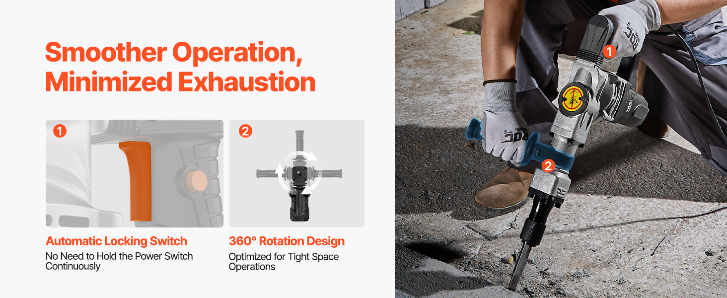 Designed To Go Above And Beyond: Continuously working can be tiring. That is why we provide you with optimal comfort! The 360°rotary handle reduces fatigue during prolonged work. It provides accuracy and precision in some relatively narrow places. The demolition hammer is also equipped with a suitcase for carrying conveniently.