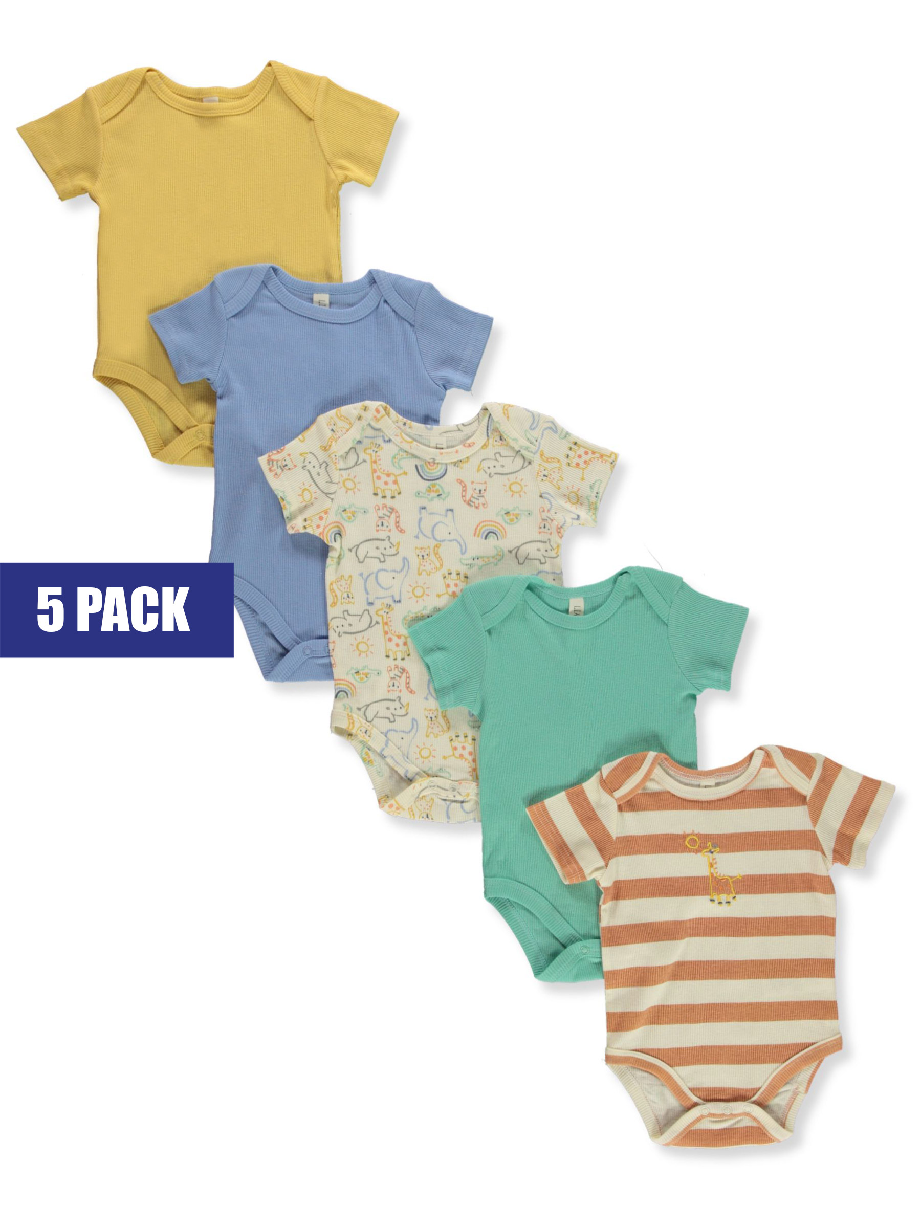 Stock up with this 5-pack from Liam & Lilly! Liam & Lilly 5-pack bodysuits Cotton construction Patterns / designs as shown Easy-change snaps 100% cotton Machine wash cold Made in China