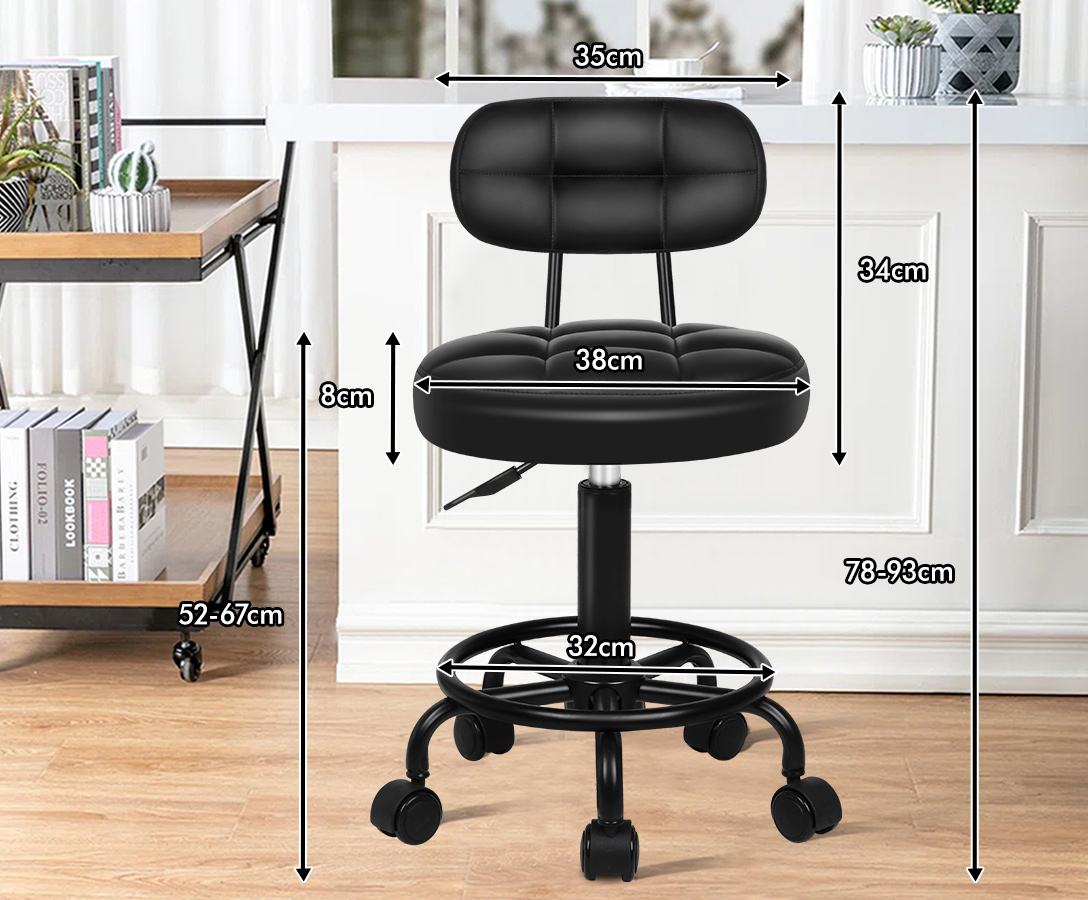 Specifications * SGS approved gas-lift, no worries about explosion * Colour: All Black* Seat material: PU leather* Base material: Steel* Finish: Black powder coated chrome* Seat thickness: 8cm* Seat height: 52 - 67cm* Seat width: 38cm* Dimensions: refer to dimension photo for detailed sizes* High weight capacity: 150kg