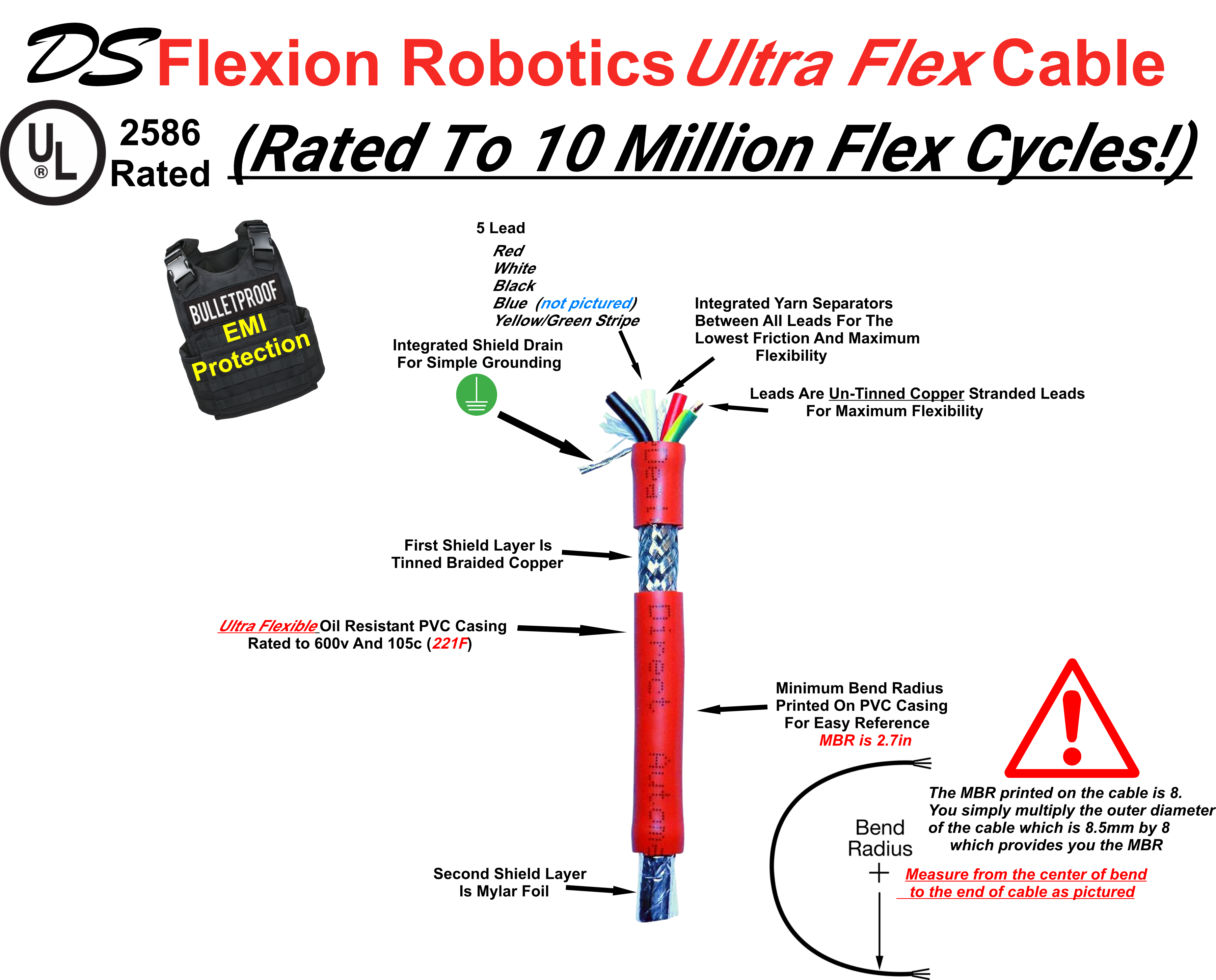 20Ft. piece of 20AWG 5 lead Double Shielded DS Flexion Robotics Grade Cable. (This cables outer diameter is 8.5mm with a minimum bend radius of 2.7in)