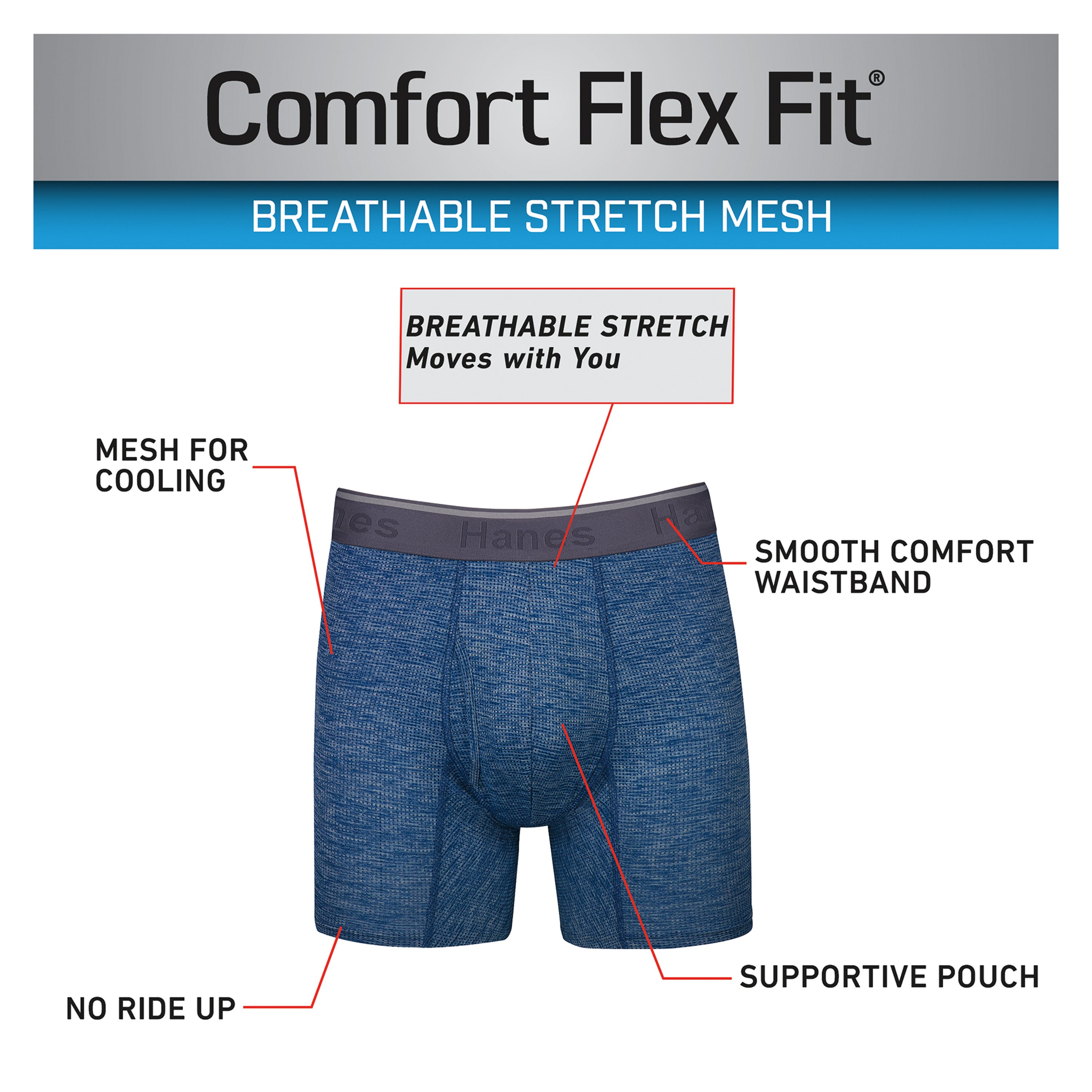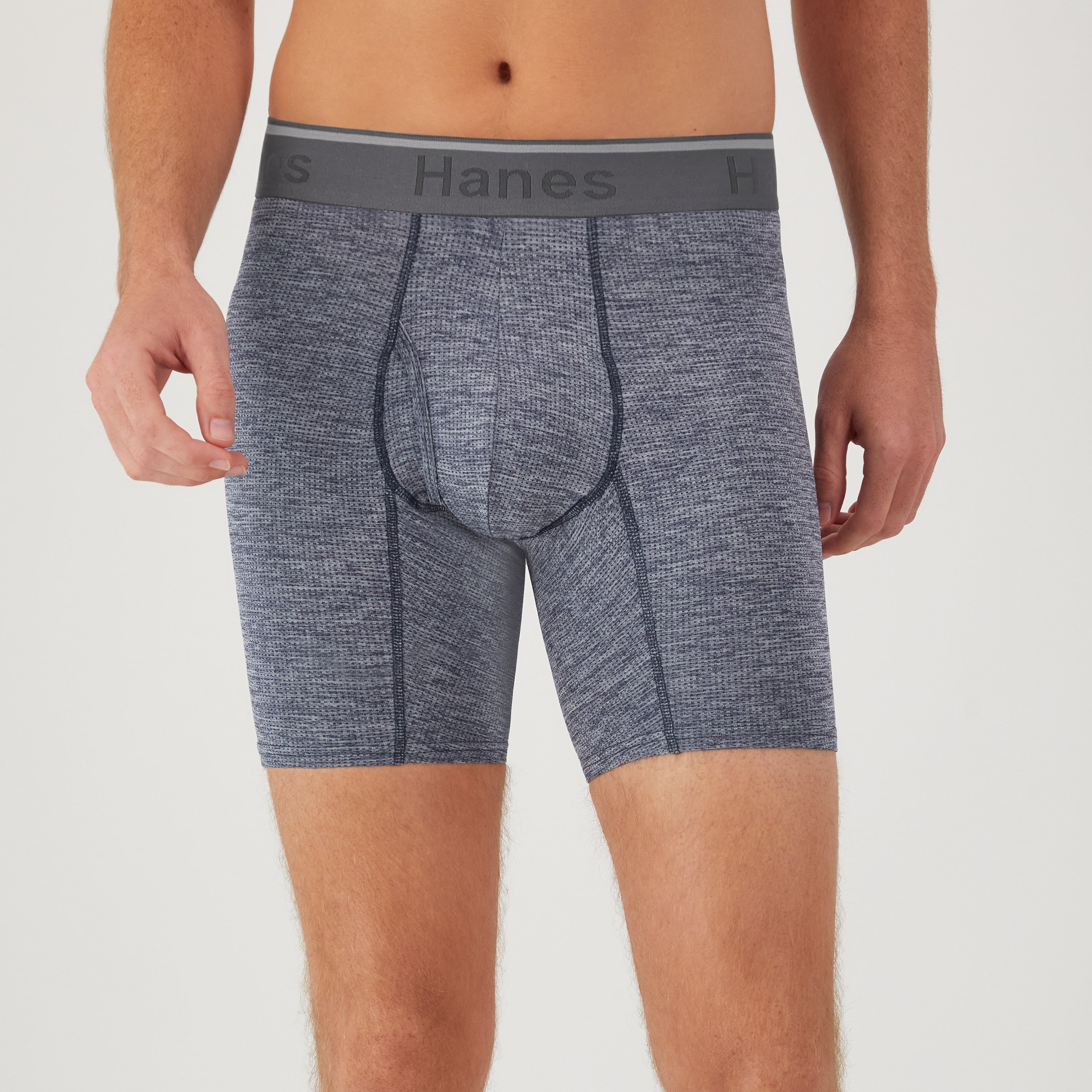 COOL & COMFY SUPPORT Soft, breathable, and cooling. Stretchy and supportive, too. Hanes Breathable Stretch Mesh Men's Boxer Briefs check all the boxes for comfort. Made to move when you do, this men's underwear wicks moisture from the skin while providing the cooling ventilation you expect from a textured mesh fabric. Odor control technology does its part to keep you feeling fresher. You'll also appreciate the ultra-smooth waistband, no-ride-up fit, and Tagless® interior. The best part? A breathable, supportive pouch that offers the support you need and the comfort you crave. Available in a convenient 3-pack so you can always keep a clean pair of Hanes boxer briefs on hand. VALUE PACK - Stock up with a convenient pack of three men's boxer briefs in assorted solid colors. SOFT & BREATHABLE - Crafted from a textured mesh blended fabric. STRETCHY - This men's underwear is made to move when you do. SUPPORTIVE - The breathable pouch provides the support you need. MOISTURE WICKING - Fabric wicks moisture from the skin, keeping you cool and comfortable. ODOR CONTROL - Odor control technology attacks the bacteria that cause odors in clothing. COMFORT WAISTBAND - Ultra-smooth waistband feels good against the skin. TAG FREE - Tagless for a smooth, itch-free interior. COLD WATER WASH - Hanes recommends machine washing these men's boxer briefs in cold water to reduce energy usage.