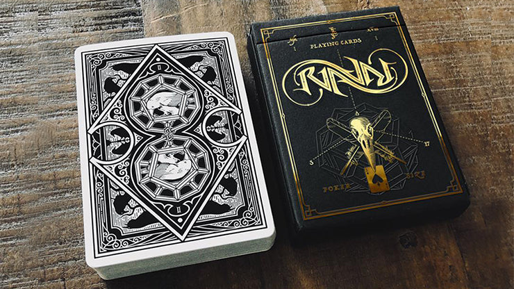 Ravn Eclipse V3 by Stockholm17 for Caroline Ravn. Limited Edition 9245 worldwide. Black back, gold foil, embossed Soft Touch tuck box. 56 cards on Cambric 310g Black Core with 9C varnish by Cartamundi. Includes 2 reveal jokers, 2 gaff cards, redesigned court cards. Perfect for magic, cardistry, and play.