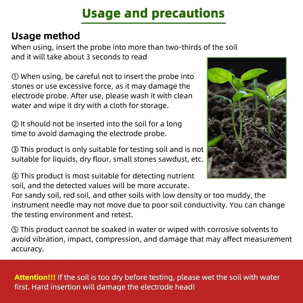 ③ . This product is only suitable for testing soil and is not suitable for liquids, dry flour, small stones sawdust, etc.