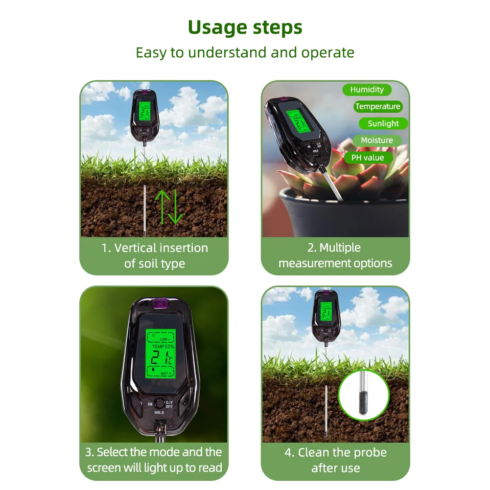 【5-in-1 Soil Tester】 Measure Humidity, Sunlight, Moisture, pH, and Temperature for optimal plant growth.