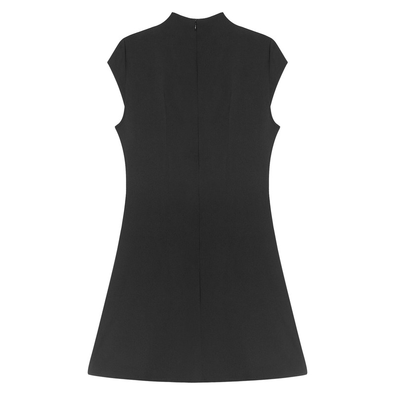 Designed with round neck, cap sleeves, high waist and waisted, A-line silhouette, single layer, solid color and back zipper closure.