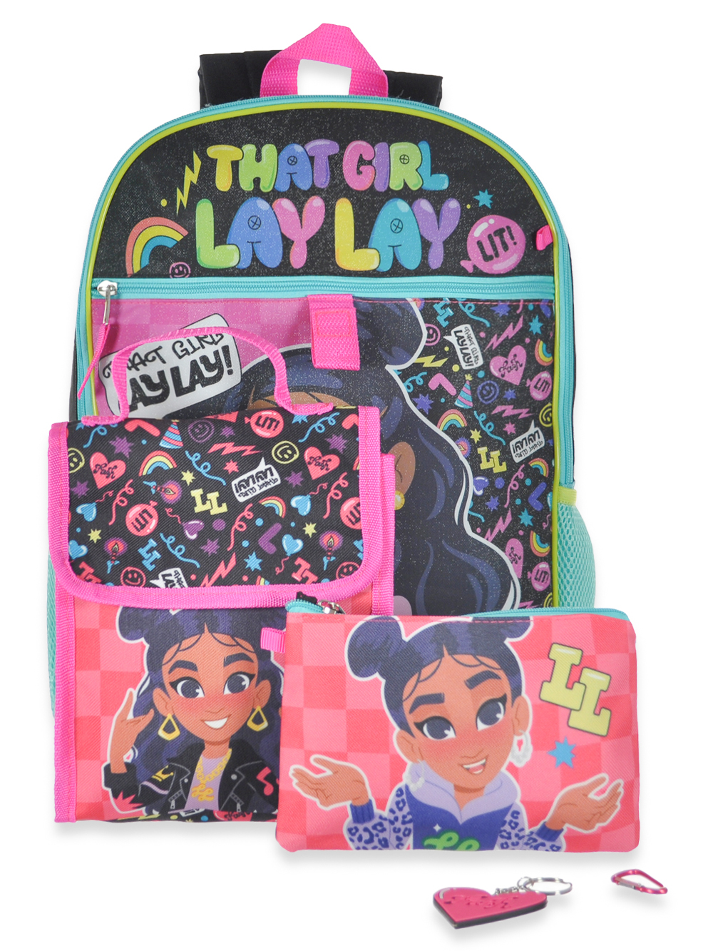 Get her all set for school with this 5-piece backpack set starring That Girl Lay Lay! That Girl Lay Lay 5-piece backpack set Backpack with padded shoulder straps, graphic applique, mesh pocket, and carry handle (100% polyester) Pencil zipper case Lunch sack with flap closure Includes matching keychain and accessory Made in China Measures 12x5x16