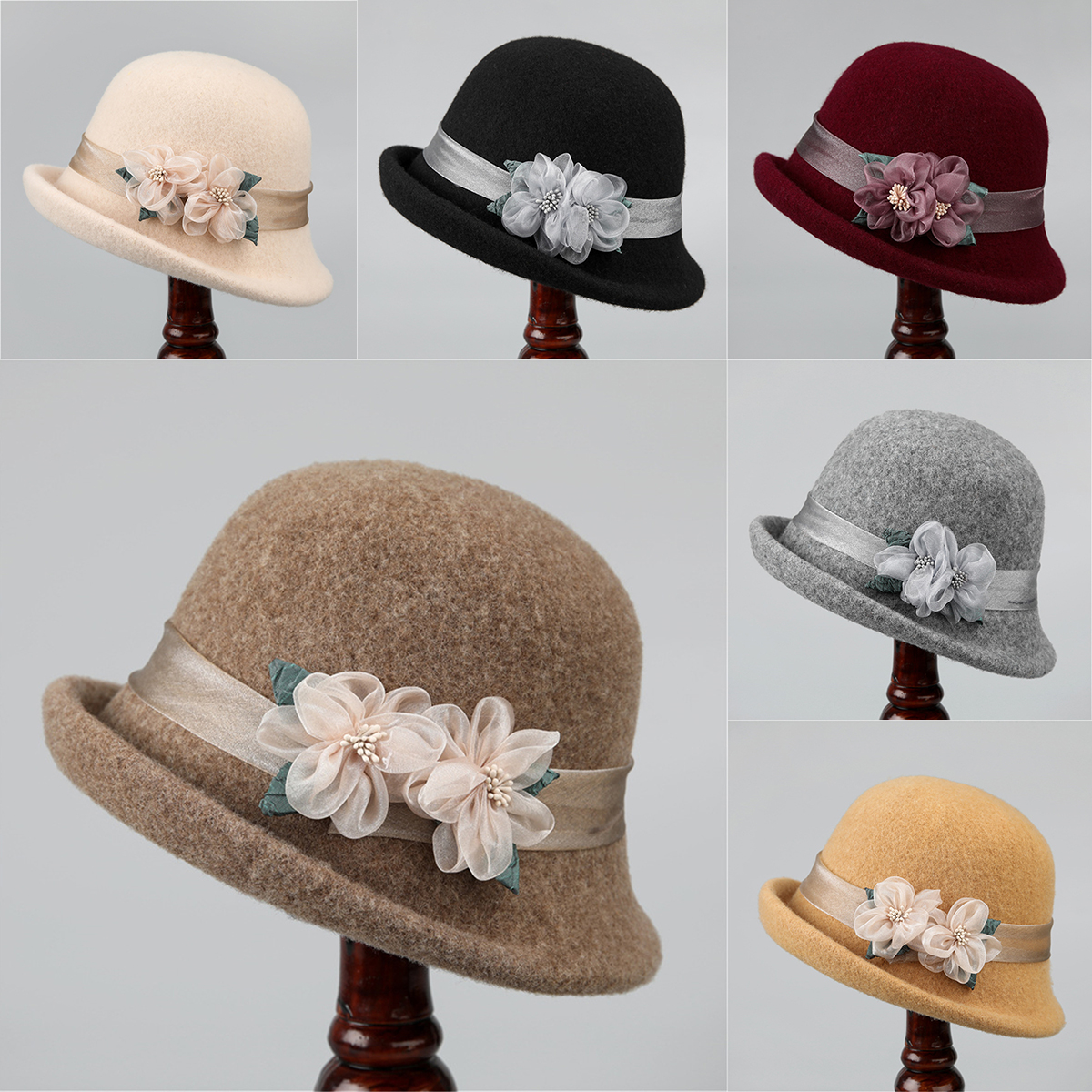 Winter Women Ladies Vintage Wool Felt Bucket Cap Flower Cloche Church Bowler Hat