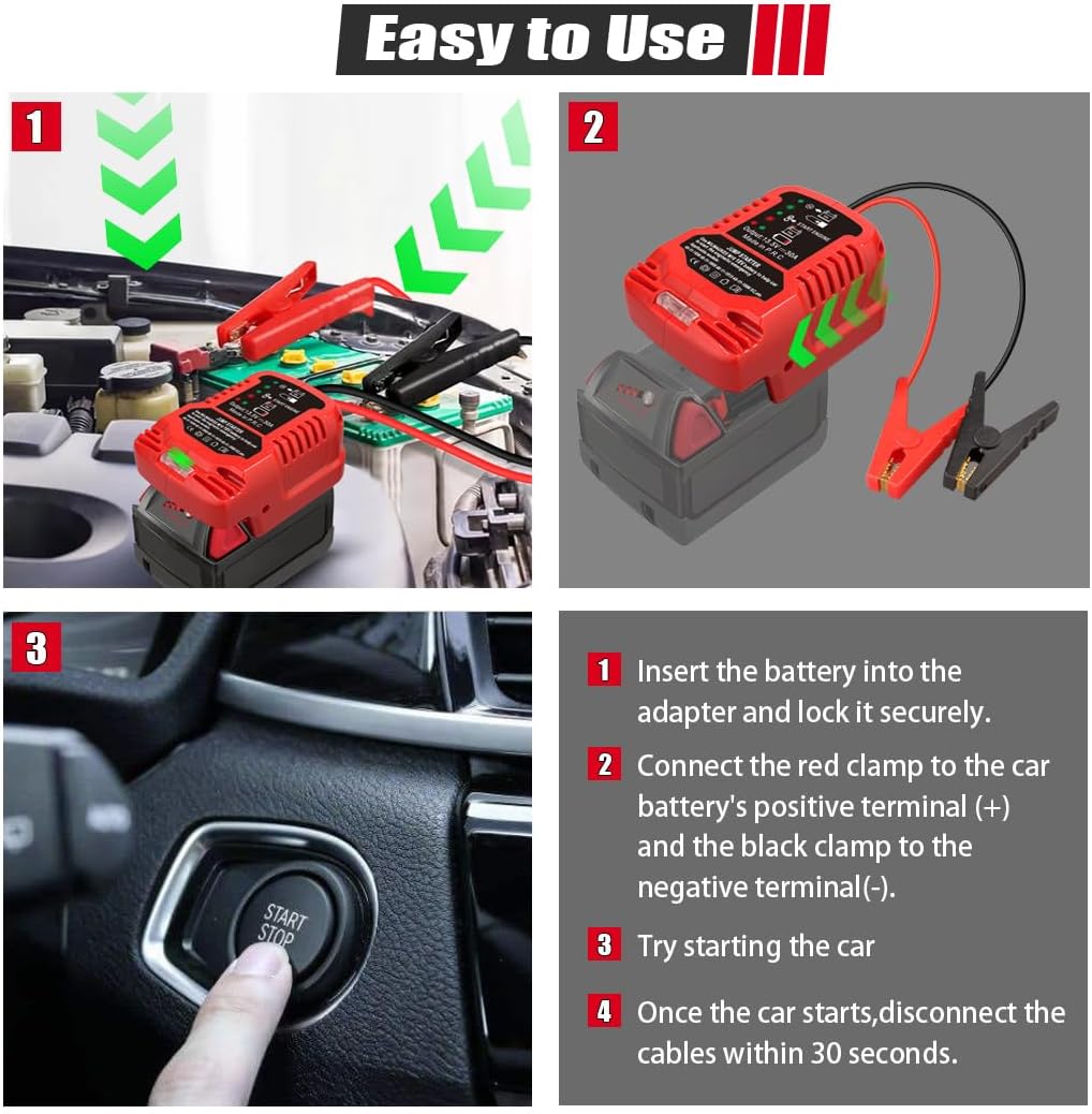 【Newly Upgraded Jump Starter】Beaspire jump starter cable is designed to be compatible only for Milwaukee battery(Compatible with Milwaukee batteries).Easy to use, only need to move the power adapter into the groove, then push converter and make sure it has locked the battery.(Battery not included).