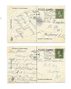 Printed in pre-WWI Germany, and published by J. Baumann in 1910, these are beautifully embossed postcards. Both of them have been posted and have 1911 cancellations across the one-cent stamps on their divided backs.