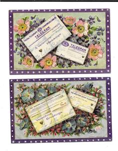 Up for bid is a wonderful set of 2 vintage Valentine postcards. The same artist has provided beautiful lithographic illustrations of telegrams that are decorated with lovely flowers. When you supersize image 1 you can better see the details. The artistry is exceptional and the colors are still vivid.