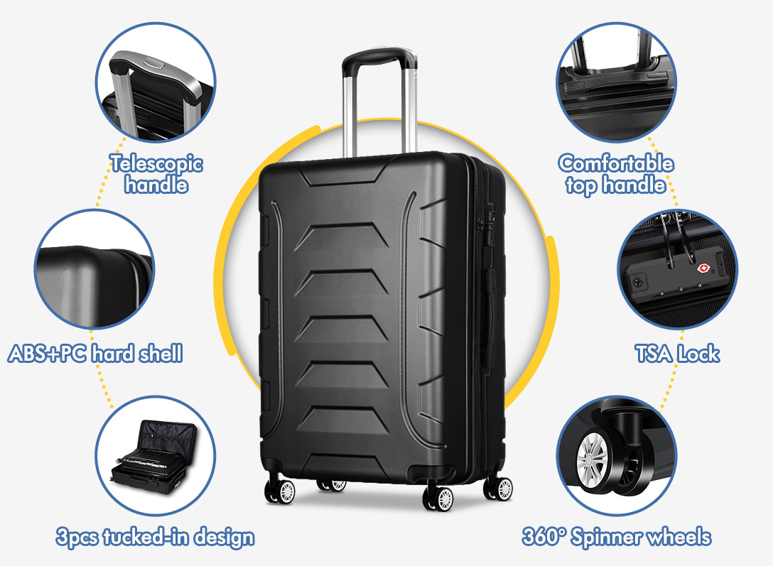 Features* 3 pieces hardshell luggage set * 20" - carry on, 24" & 28" checked * Durable ABS & PC hardshell, lightweight & scratch-resistant * TSA safety combination lock * Oversized 360° 8-wheel spinner * Built-in retractable trolley system * Aluminum pull rod * 4 side studs to allow the luggage to be laid on the ground steadily * Top and side carrying handles* Smaller size luggage can be kept inside larger luggage