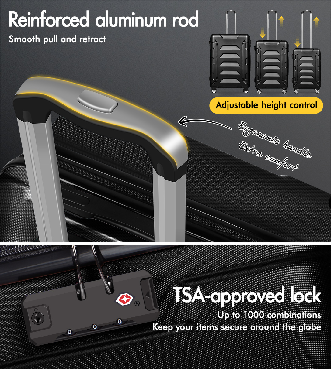 Enhanced security is important, with the TSA lock and sturdy handles, your belongings will remain safe and secure throughout your adventure.