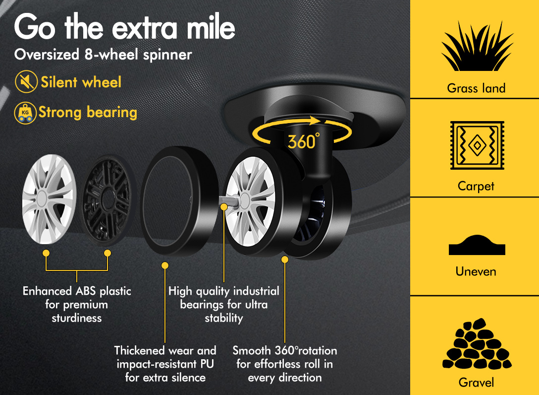 Navigating through crowded airports and bustling streets are a breeze, thanks to the oversized 360° 8-wheel spinner that ensure smooth mobility in any direction. The adjustable retractable pull rod offers height flexibility, making it comfortable for all travelers.