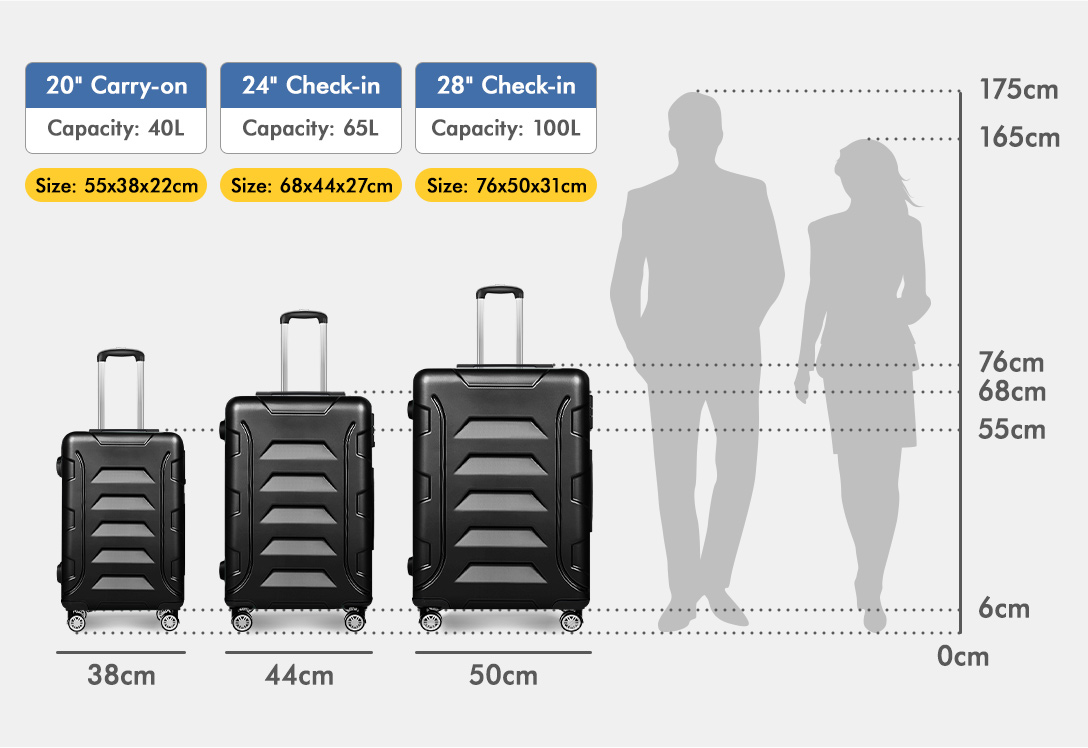 Specifications* Model: Dina * Material: ABS + PC* Interior: Eco-friendly polyester lining * Handle: Premium aluminum, PP* 20" weight and dimension: 3kg, 38 x 22 x 55cm* 24" weight and dimension: 4kg, 44 x 27 x 68cm * 28" weight and dimension: 5kg, 50 x 31 x 76cm * 20" loading capacity: 40L * 24" loading capacity: 65L * 28" loading capacity: 100L* Height with handle pull out: 107cm* Colour: Black